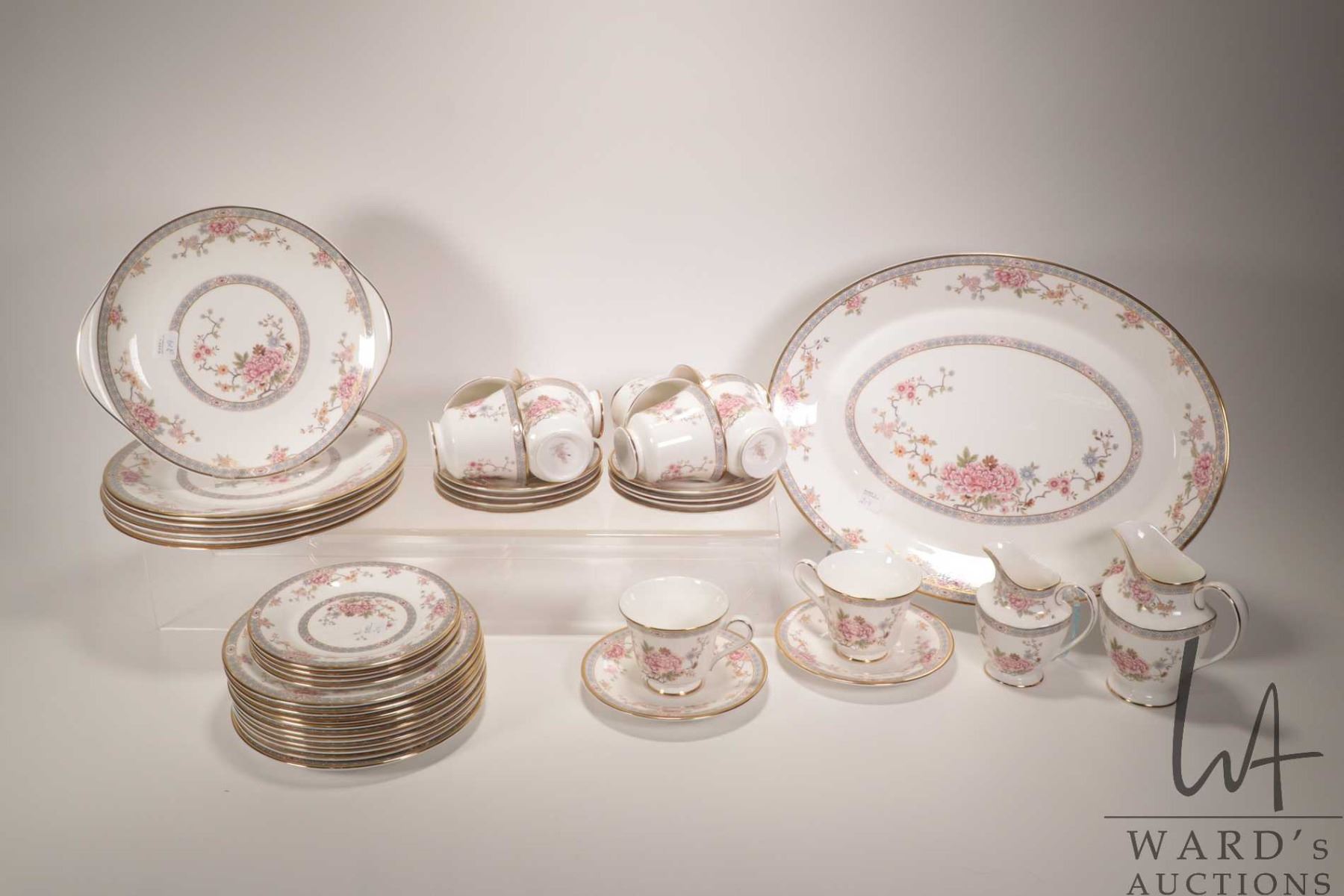 Selection of Royal Doulton fine bone china "Canton" H5052 including five 10 1/2" plates, ten 8" plates, four 6 1/2" plates, ten cups and saucers, milk and cream jugs, double handled cake plate and a 16 1/2" platter