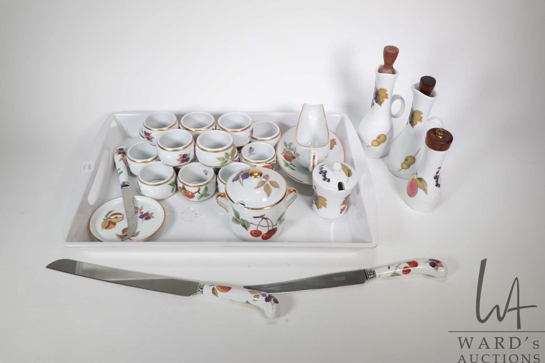 Selection of Royal Worcester Evesham Gold fine porcelain including sixteen napkin holder, oil and vinegar bottles with wooden corks, pepper grinder, two spooners, small sauce boat, cheese knife, brad knive and a cake knife and a small pin tray. Note: Not available for shipping. Local pickup only