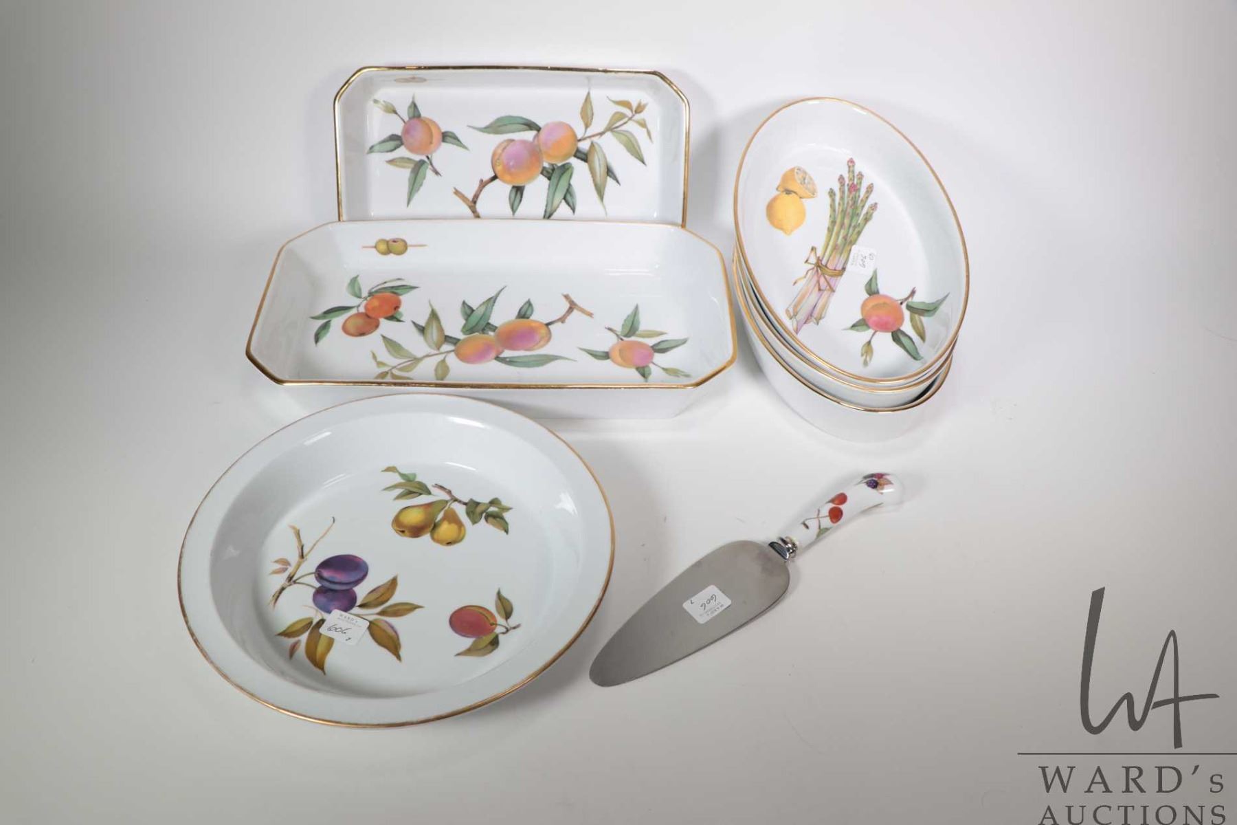 Selection of Royal Worcester Evesham Gold fine porcelain including three oval baking dishes, two rectangular baking dishes including 11" and 14" and a 9" pie plate with slice. Note: Not available for shipping. Local pickup only