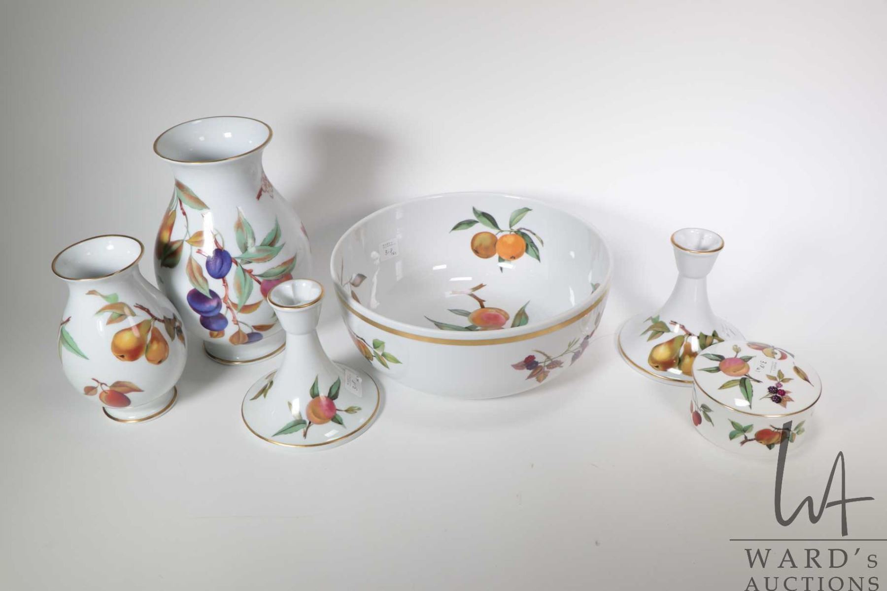 Selection of Royal Worcester Evesham Gold including center bowl 10" in diameter, 9" vase, 7" vase, lidded trinket box and a pair of candlesticks. Note: Not available for shipping. Local pickup only