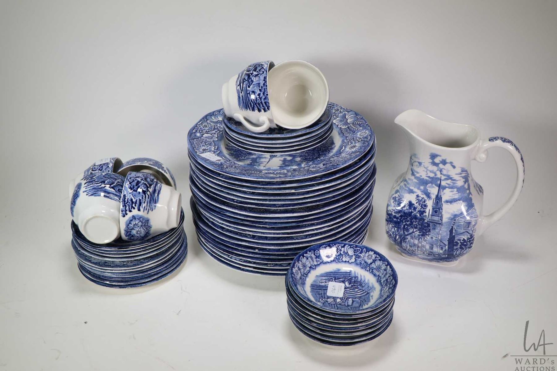 Selection of Staffordshire "Liberty Blue" stoneware dinner ware including nineteen dinner plates, sixteen saucers, six tea cups and eight fruit nappies plus one water pitcher. Note: Not available for shipping. Local pickup only