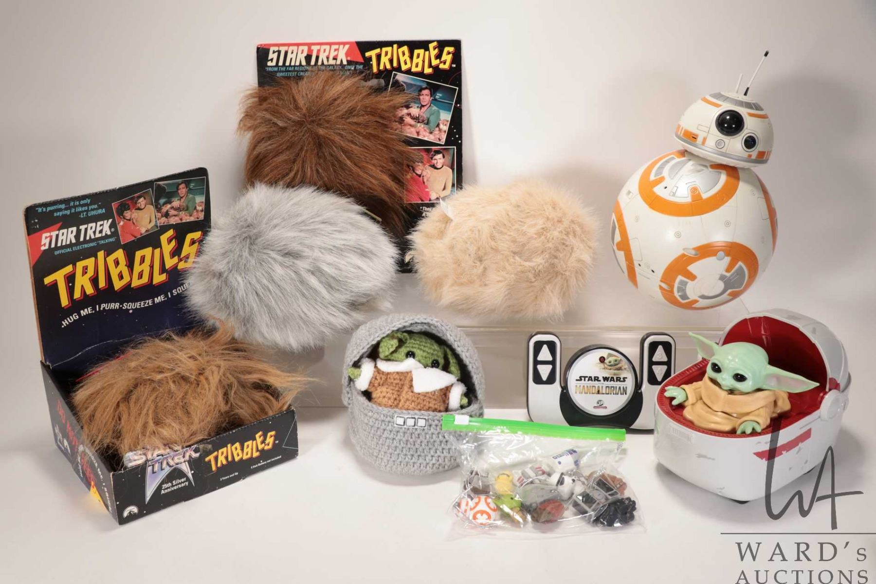 Selection of Star Trek and Star Wars collectibles including battery operated Tribbles, remote contro