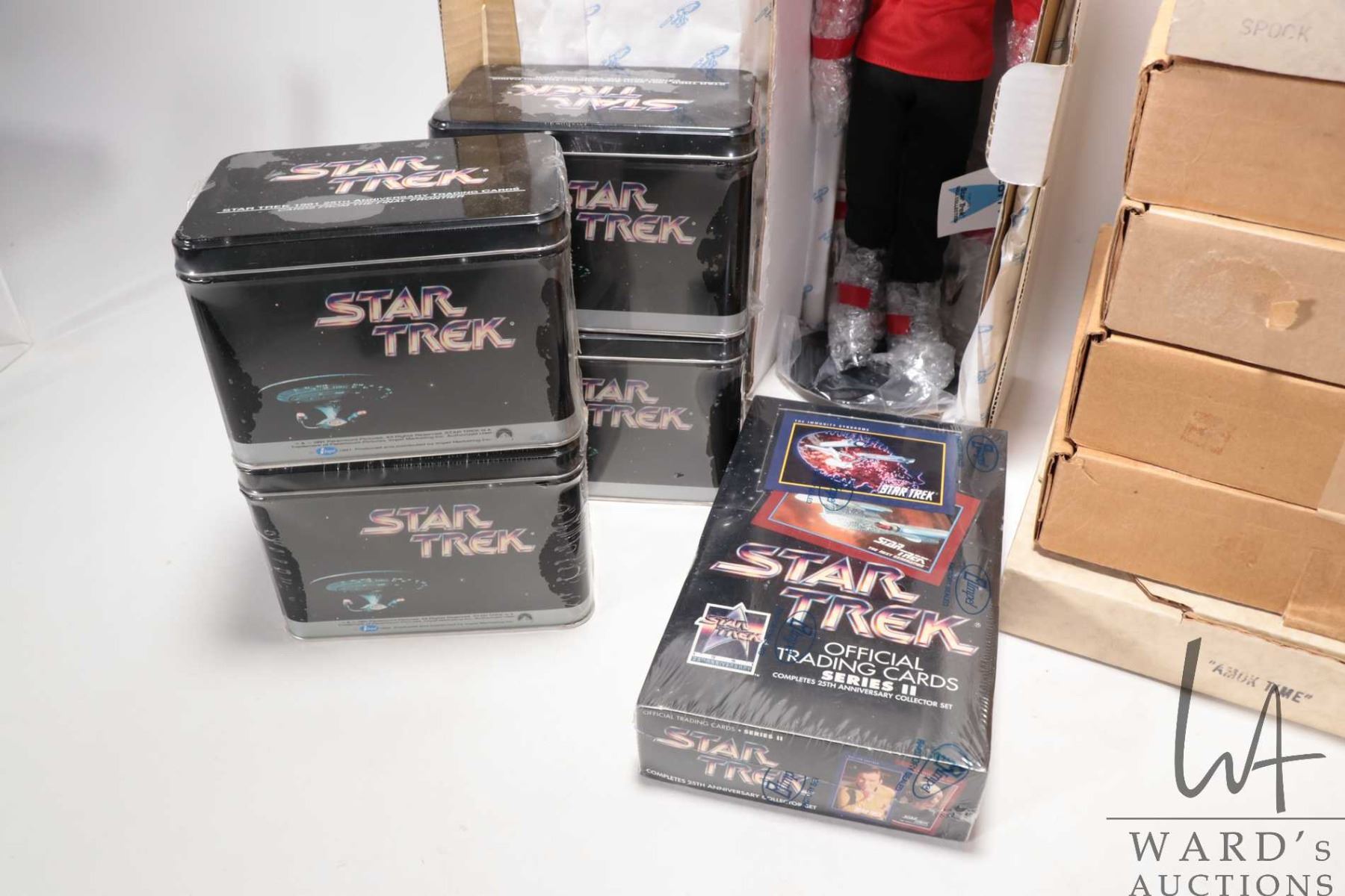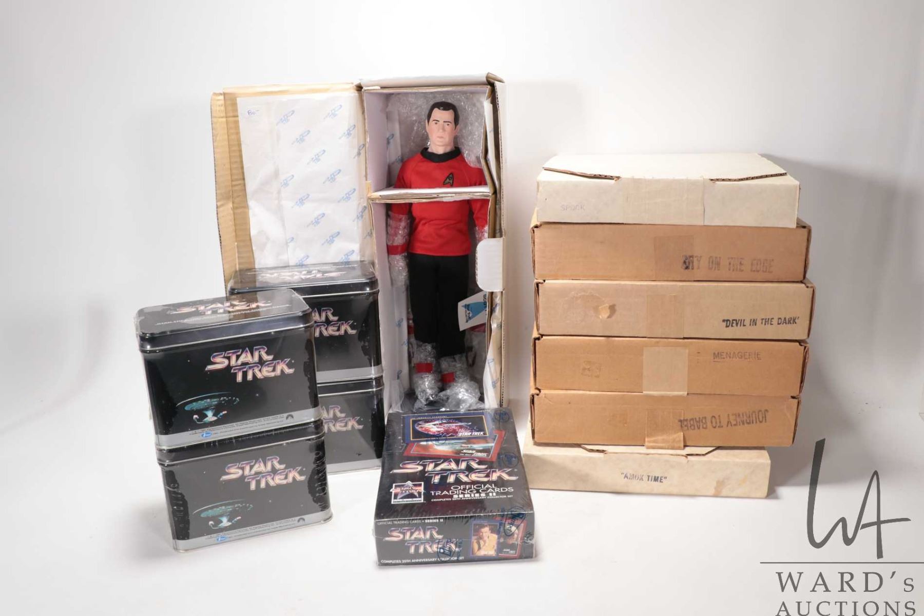 Selection of Star Trek collectibles including porcelain Scotty doll, four sealed sets of 25th Anniversary trading cards, one sealed set Series 2 25th Anniversary trading cards, etc