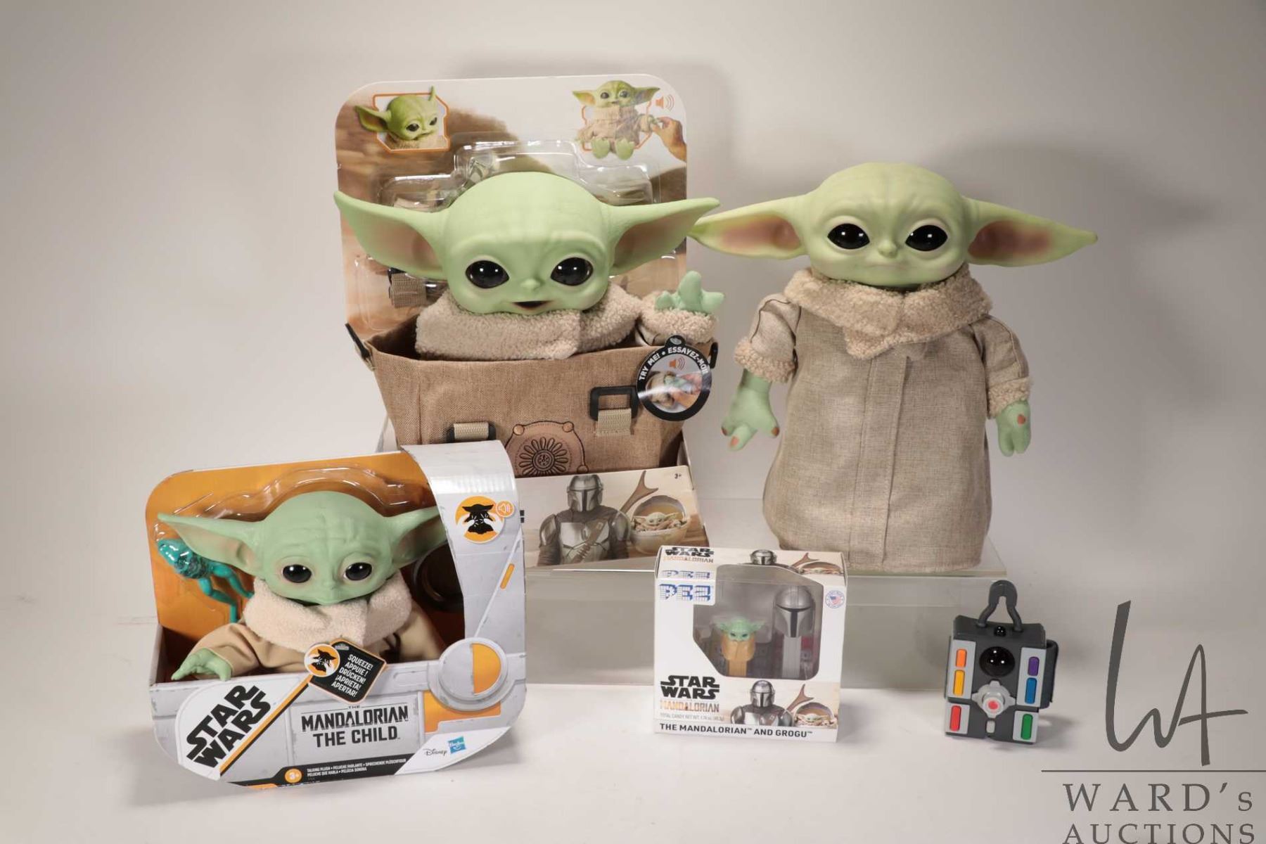 Selection of Star Wars Mandalorian The Child Baby Yoda collectibles including remote control toy, Pez dispensers, plush toys etc.