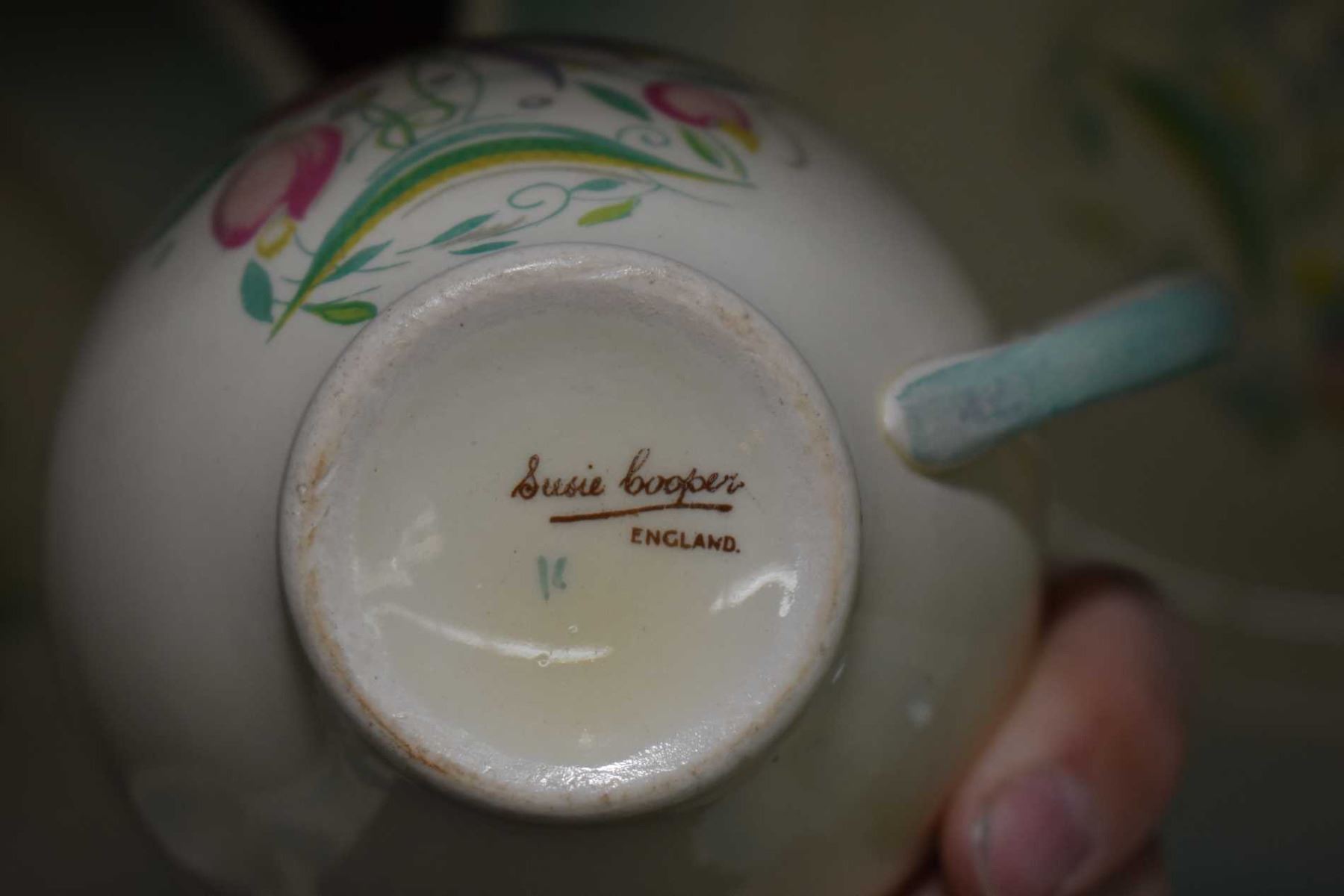 Selection of Susie Cooper Production "Dresden Spray" dinner ware including settings for nine of dinner plates, side plates, bread and butter plates, tea cups and saucers, and soups with under plates plus seven cereal bowls, eight fruit nappies, three small bowls, teapot, cream and lidded sugar, two covered vegetable dishes, two open vegetable dishes, double handled casserole, two meat platters, oval serving dish, gravy with drip tray, two condiment bowls, three egg cups etc. all circa 1930. Not available for shipping. Local bidders only