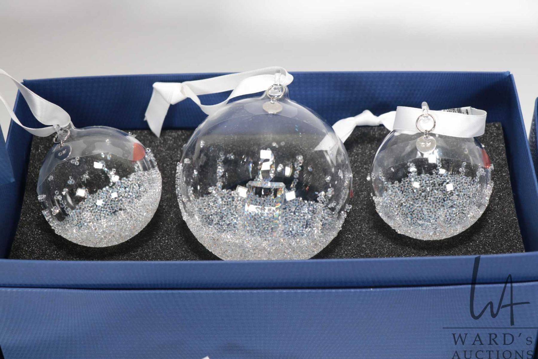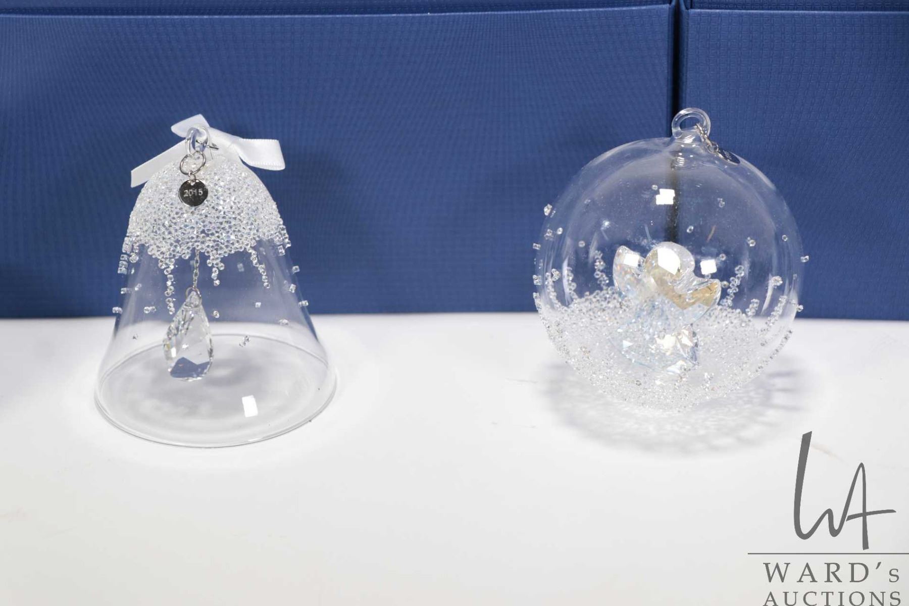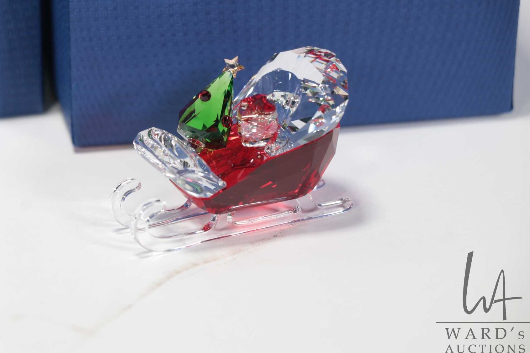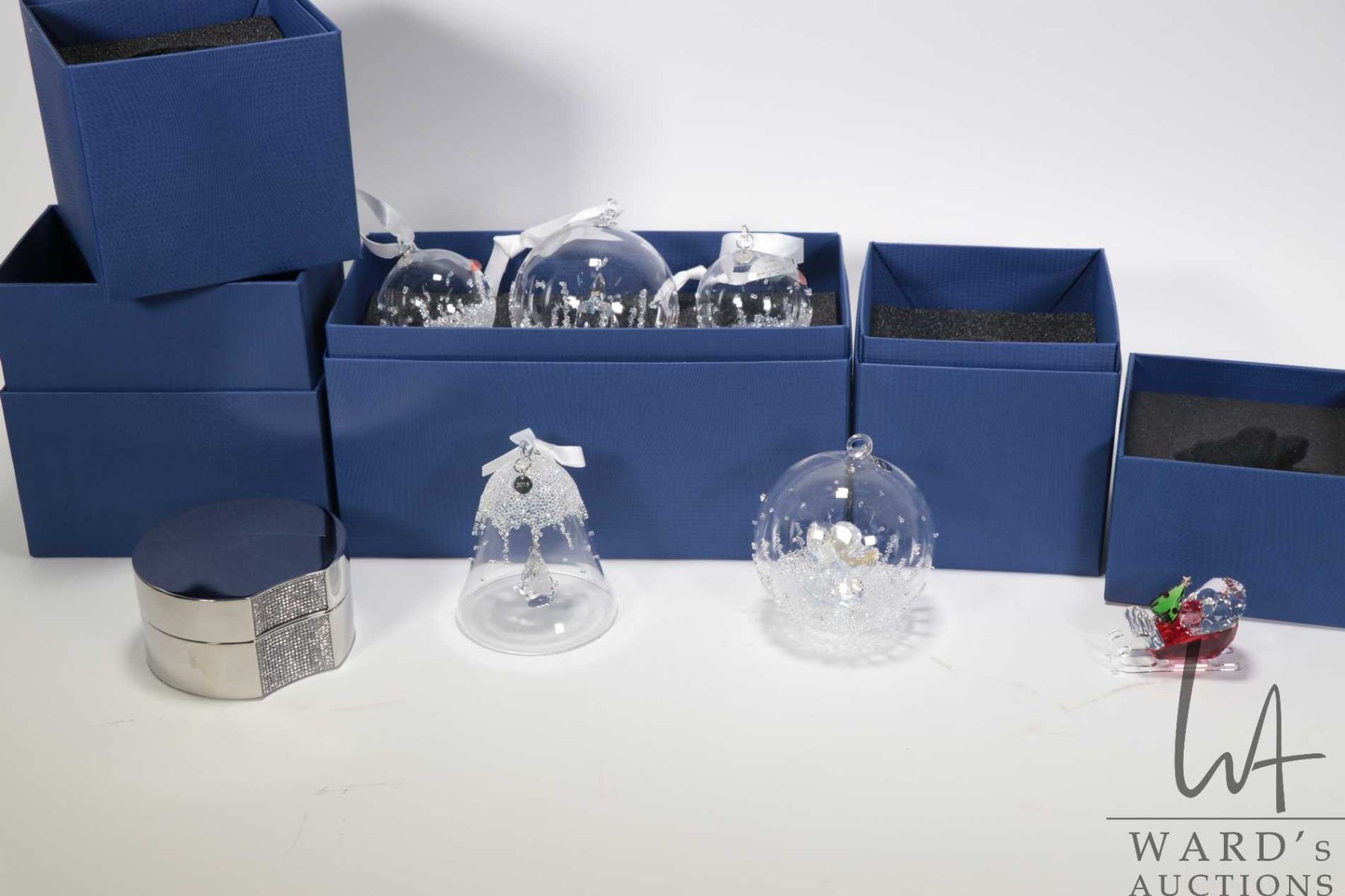 Selection of Swarovski collectlble glass Christmas ornaments, a crystal Swarovski Santa on a sleight and a small lidded jewel box