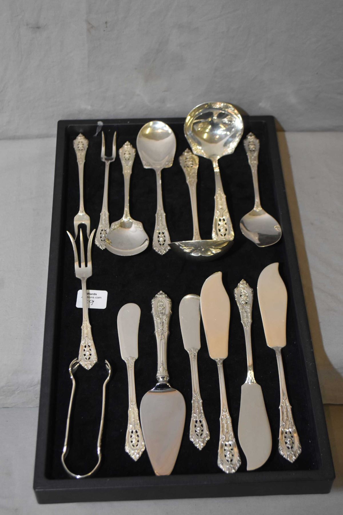 Selection of Wallace Rosepoint sterling silver including two sauce ladles, two sugar spoons, two pickle forks, set of sugar tongs, three butter spreaders, two smaller spreaders, small pie slice, three tined fork and a compote spoon, 15 pieces in total, to match lot 58
