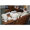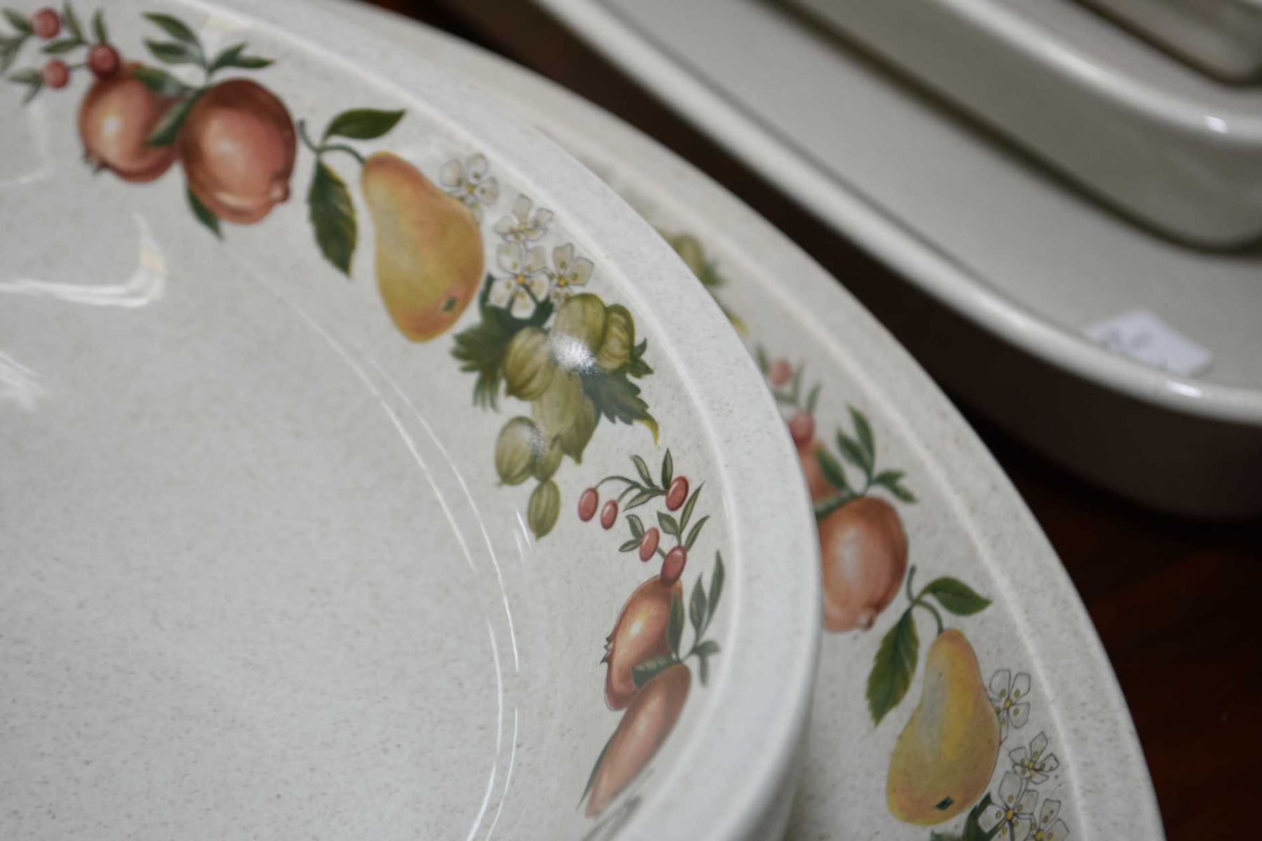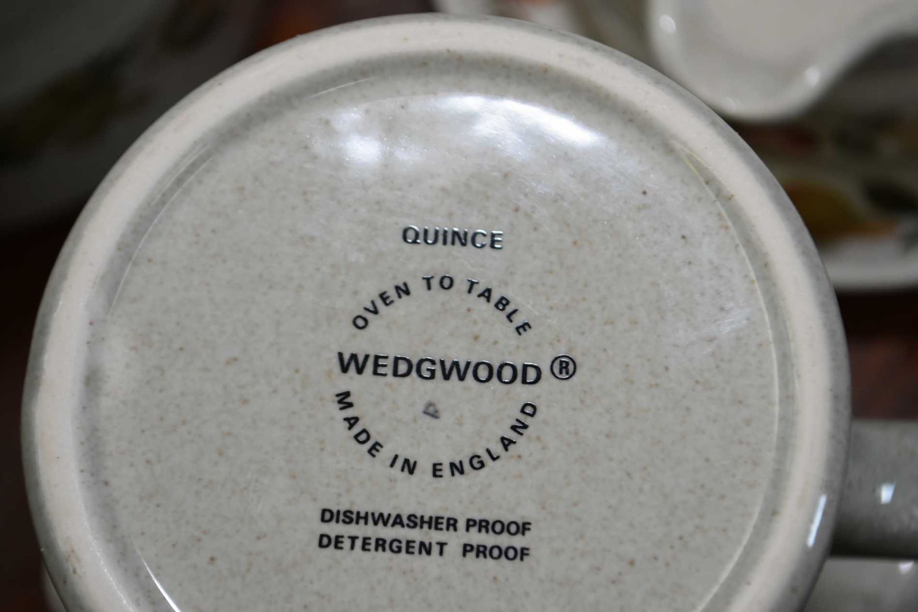 This item is not available for shipping. Local pickup only. Selection of Wedgwood "Quince" stoneware oven to table serving piecing including two lidded casseroles, 15" round platter, three pie plates, three open vegetable dishes, two oval platters, four graduated baking pans, shaker, two lidded mustards with spoons, gravy and drip tray and one pitcher etc.