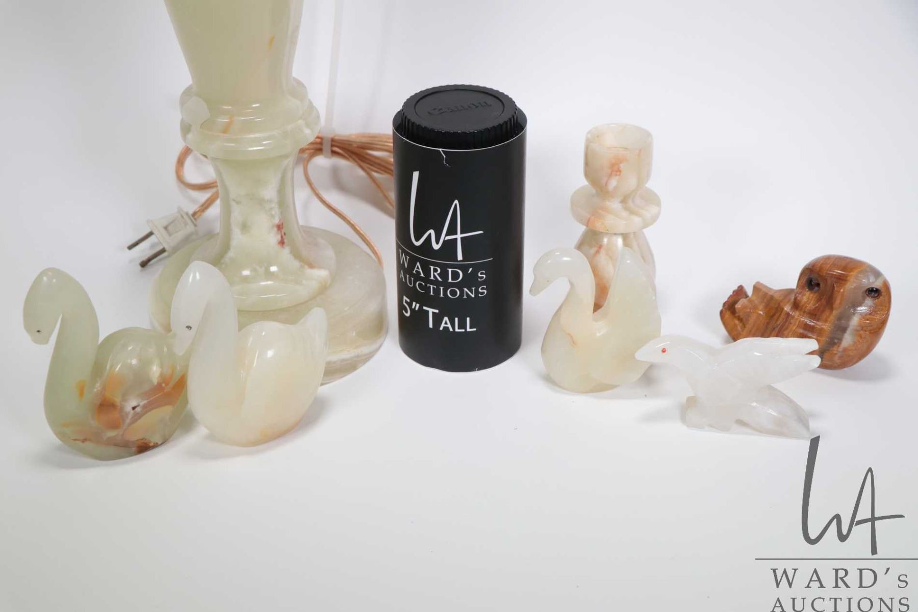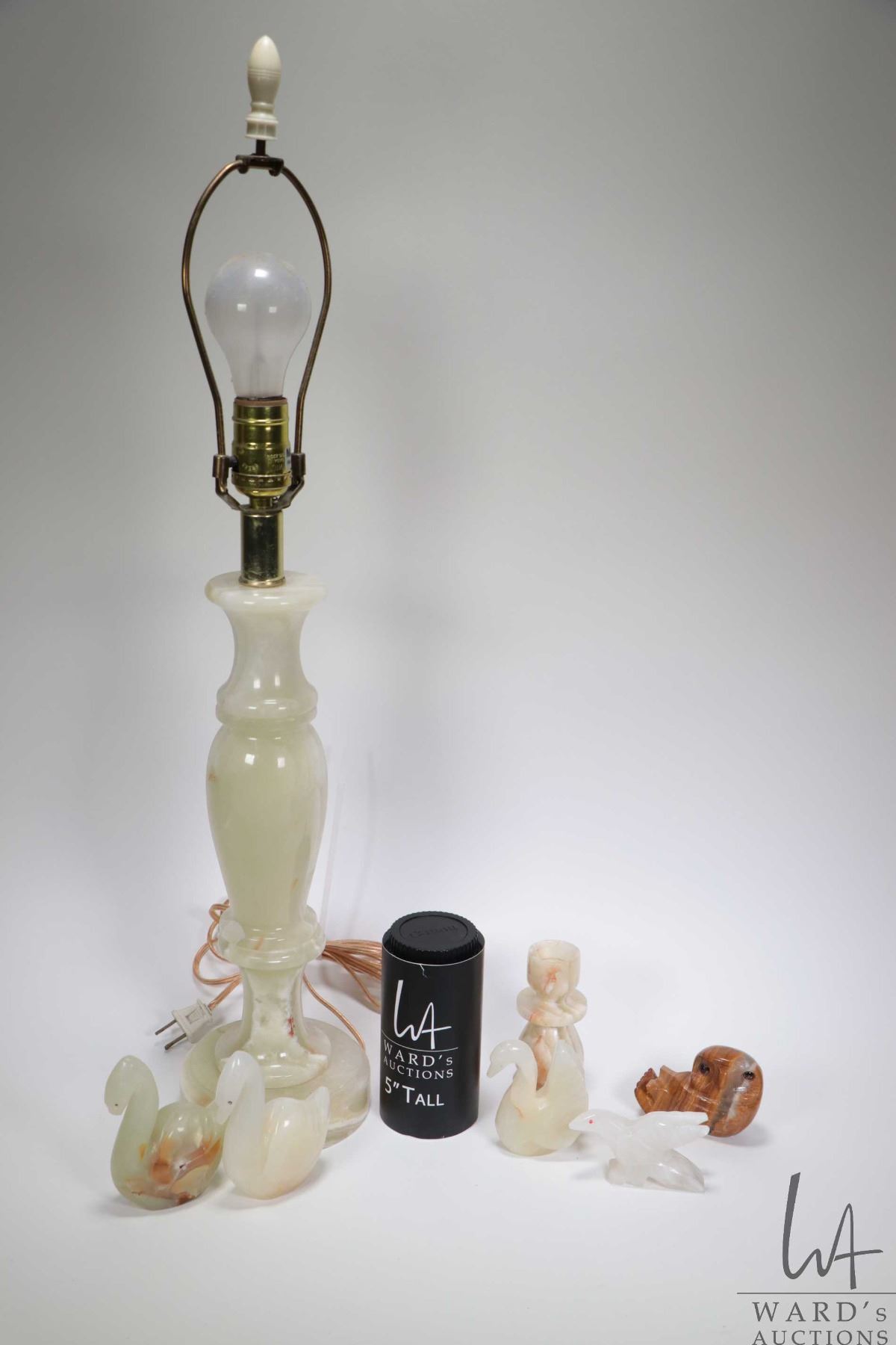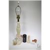 Selection of alabaster and marble collectibles including 27" table lamp and assorted figures plus candlestick