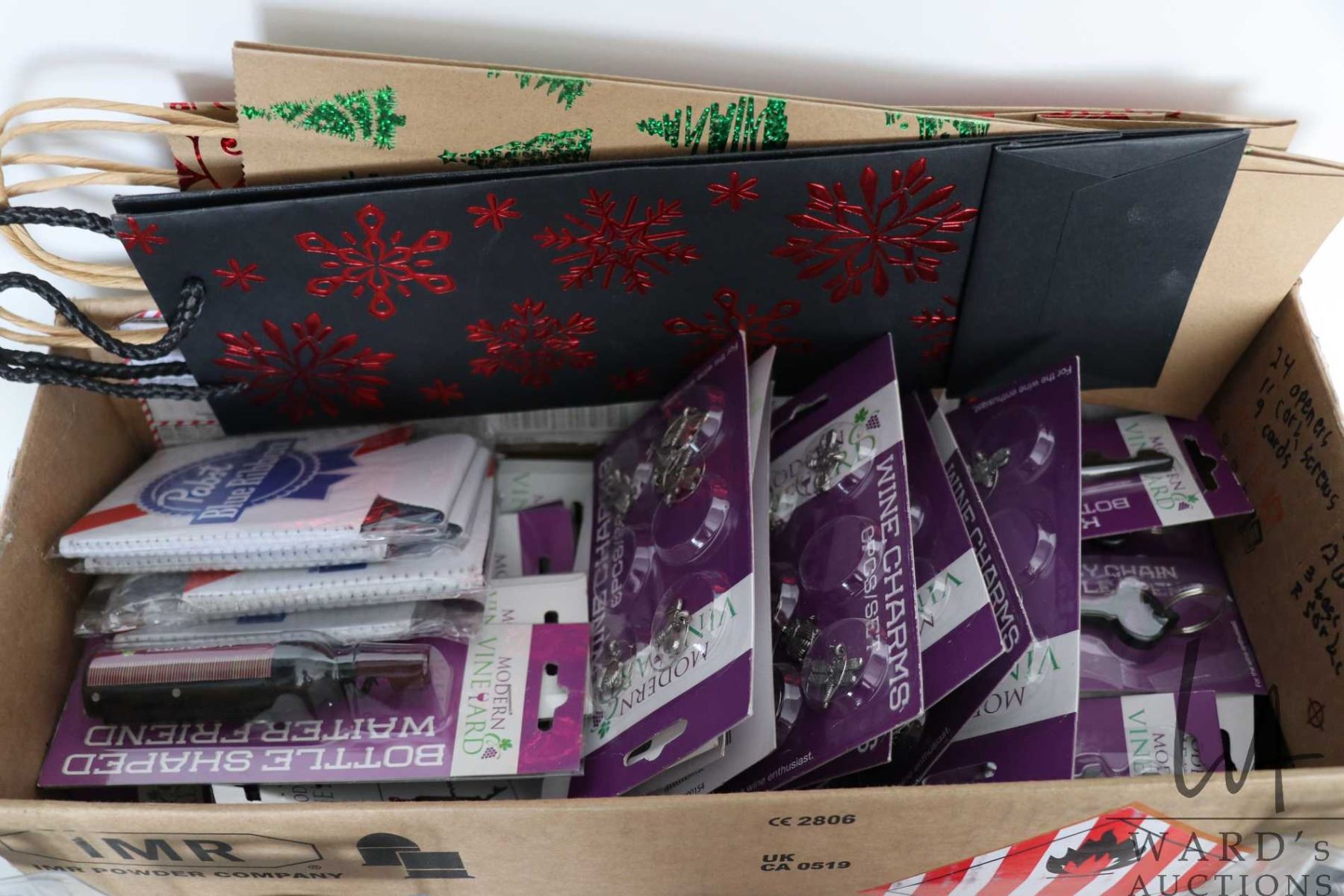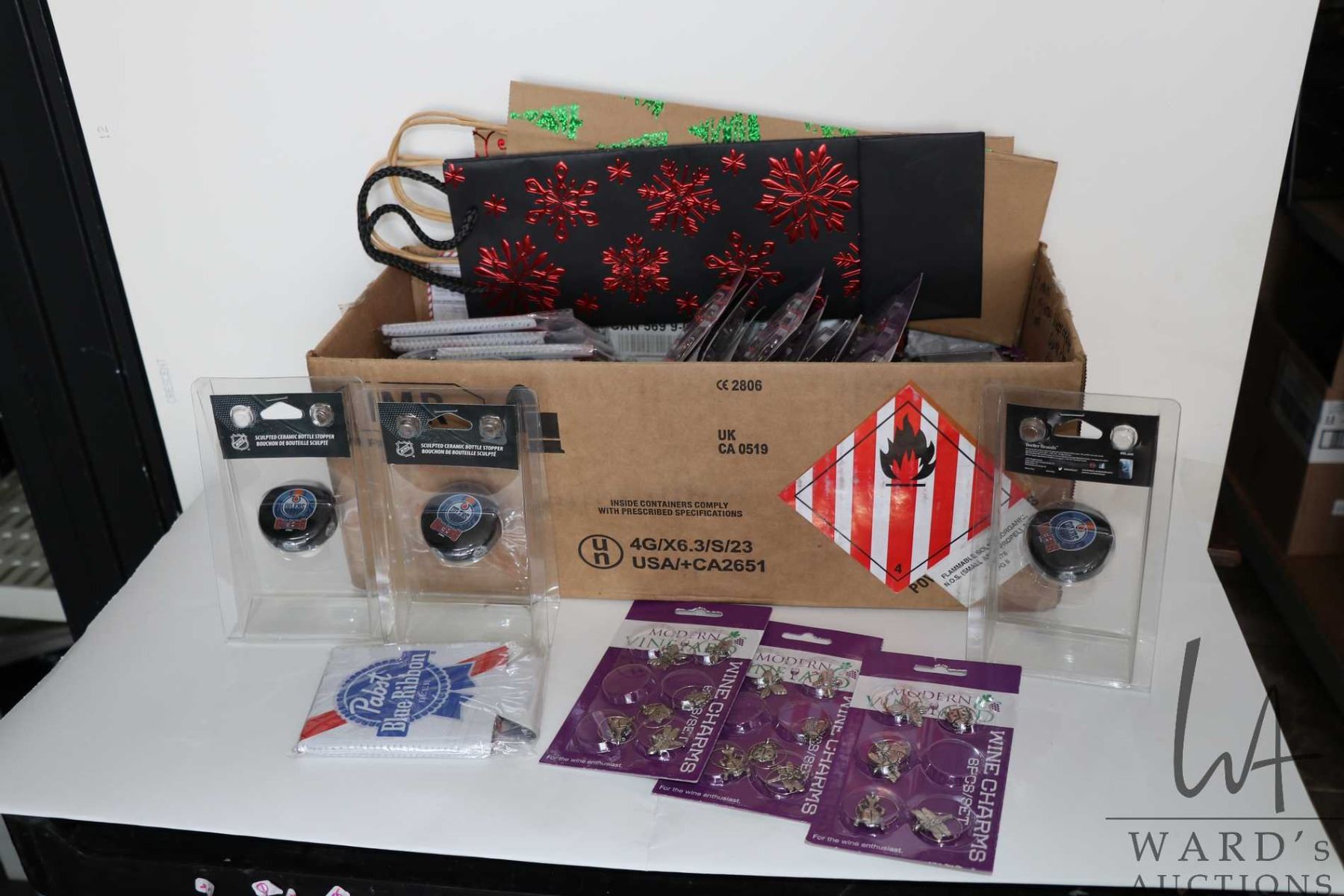 Selection of alcohol relate accessories including 25 bottle openers, 11 corkscrews, 8 card style openers, 6 beer caddys, 13 packs of wine charms, 3 Oilers corks and 3 wine bags Note: Alcohol cannot be insured by any courier in Canada. Local pick up is recommended. Canadian bidders only