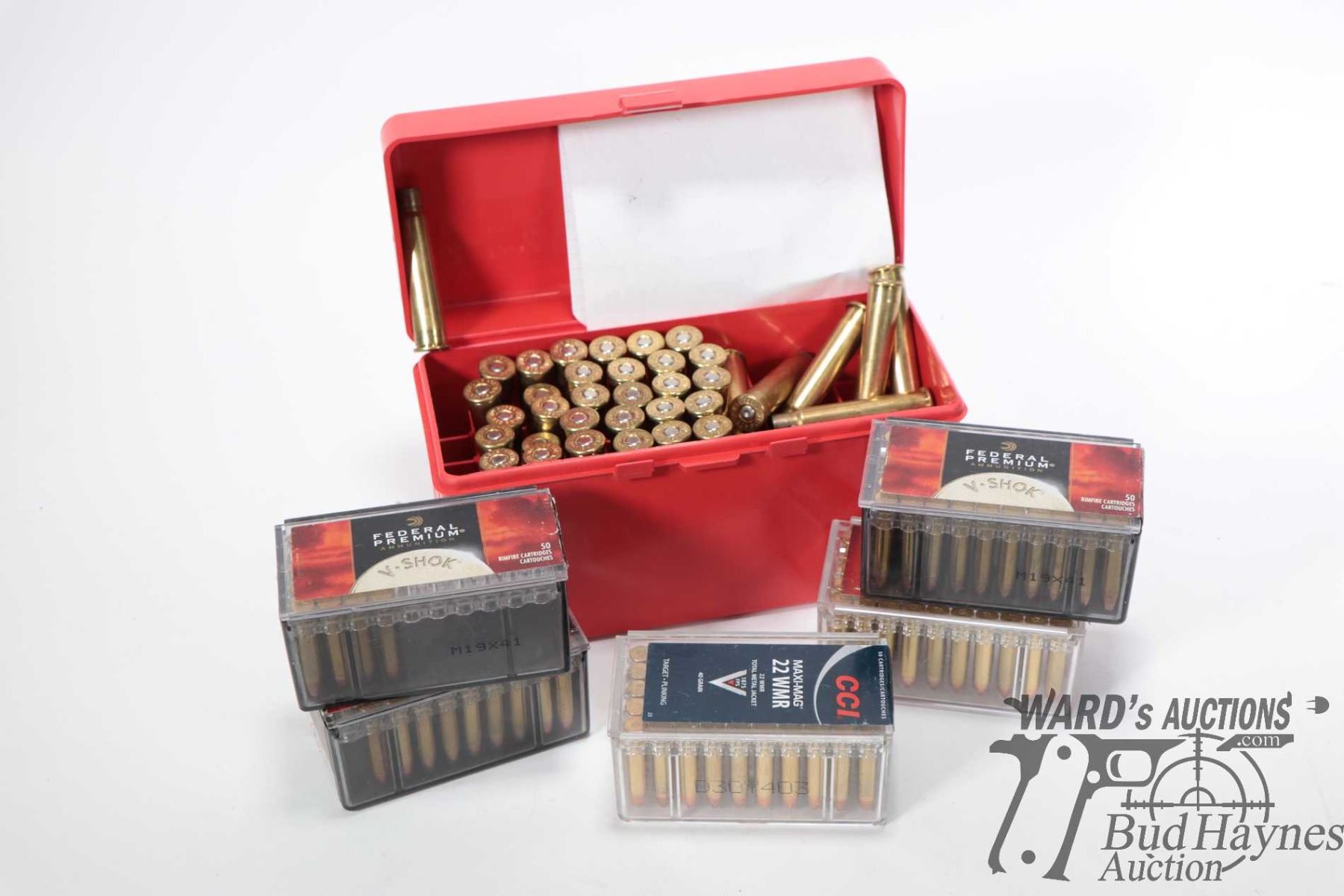 Selection of ammunition including a red Case-gard ammo. box with 30 rounds of .303 British reloads and 10 empty cases. Approximately 200 rounds of .22 Magnum ammunition. Descriptions subject to change.