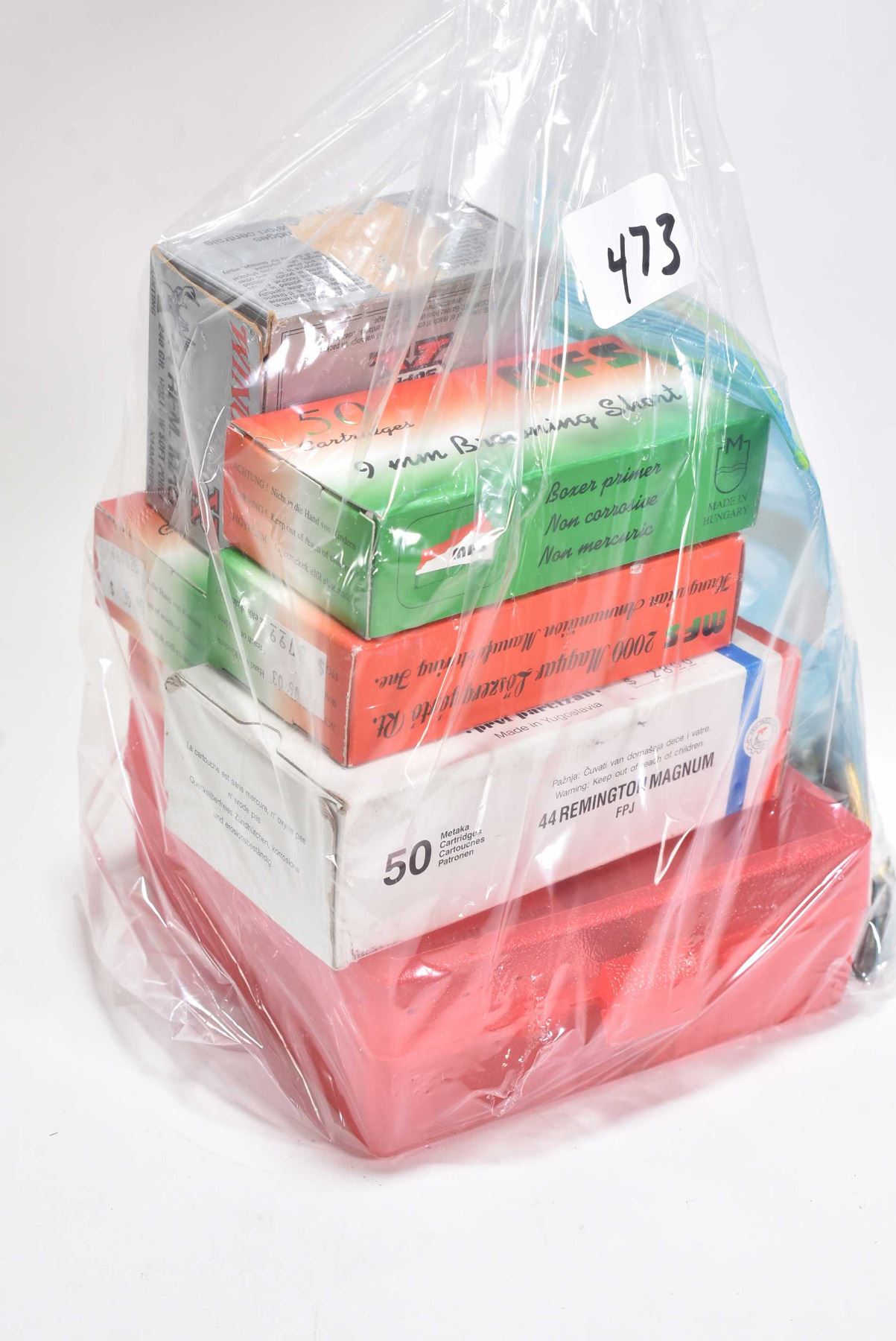 Selection of ammunition including four full 50 count boxes of MFS 9mm Browning short, a 50 count box of .44 Remington mag, a 25 count box of Winchester .44 Winchester mag, a bag containing approximately 20 count of 9mm and .44 cal, and a plastic containing with 14 count .44 Rem reloads