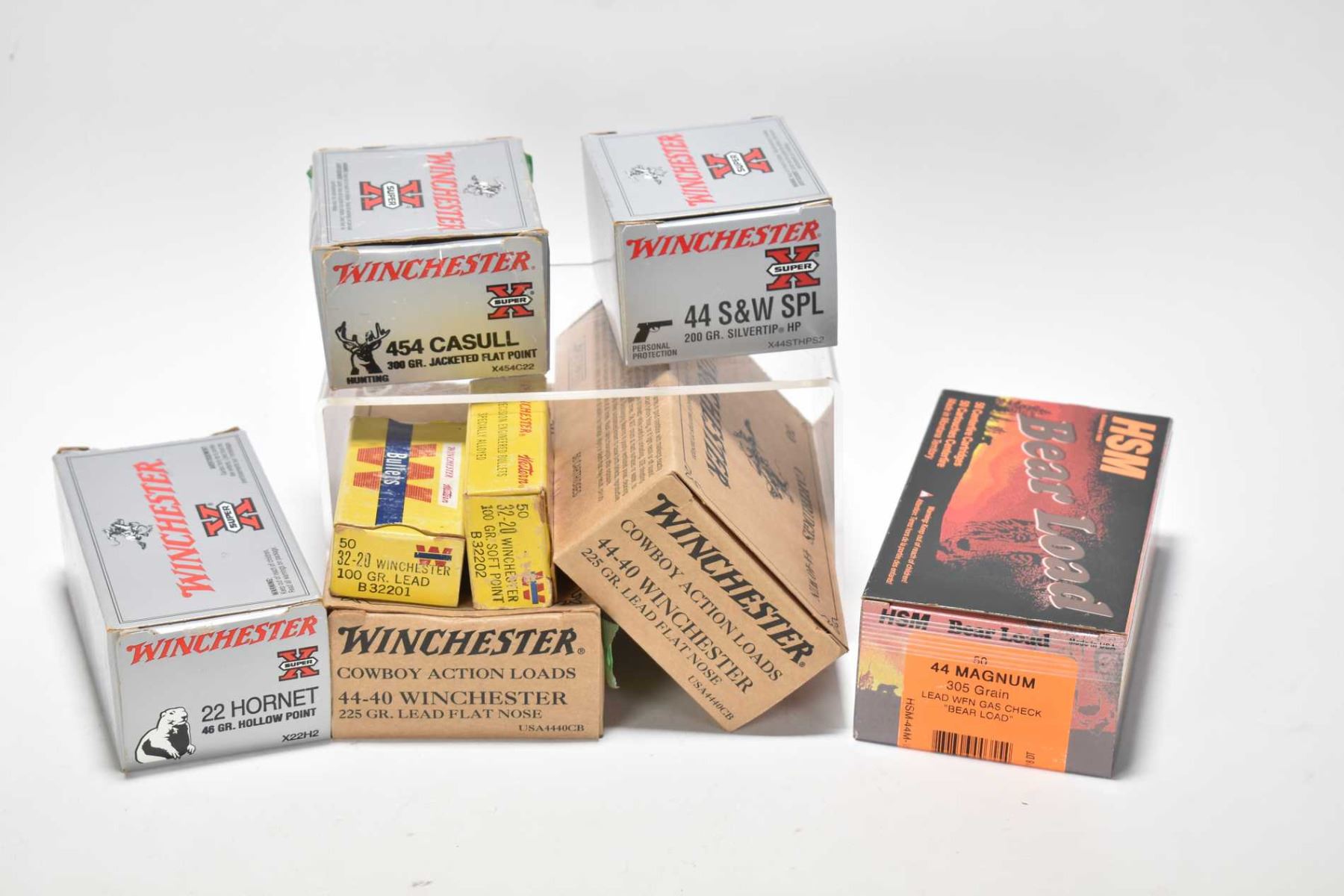 Selection of ammunition including full 50 count box of HMS 305 grain .44 Magnum, full 50 count box of Winchester Cowboy Action 44-40 cal., two full 50 count boxes of Winchester 32-20, full 20 count box of Winchester .44 S&W Special cal., full 50 count box of Winchester .22 Hornet plus a selection of empty brass.