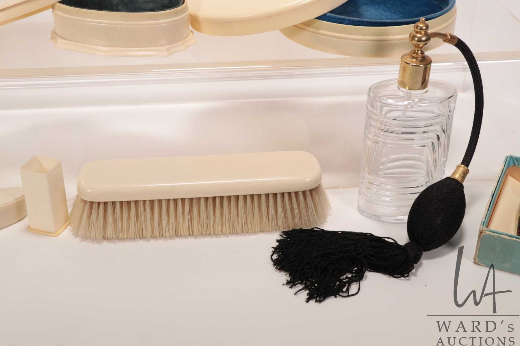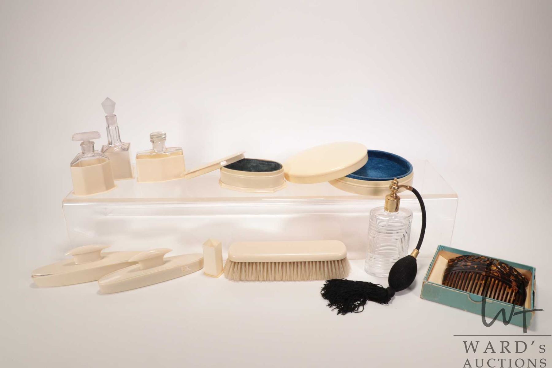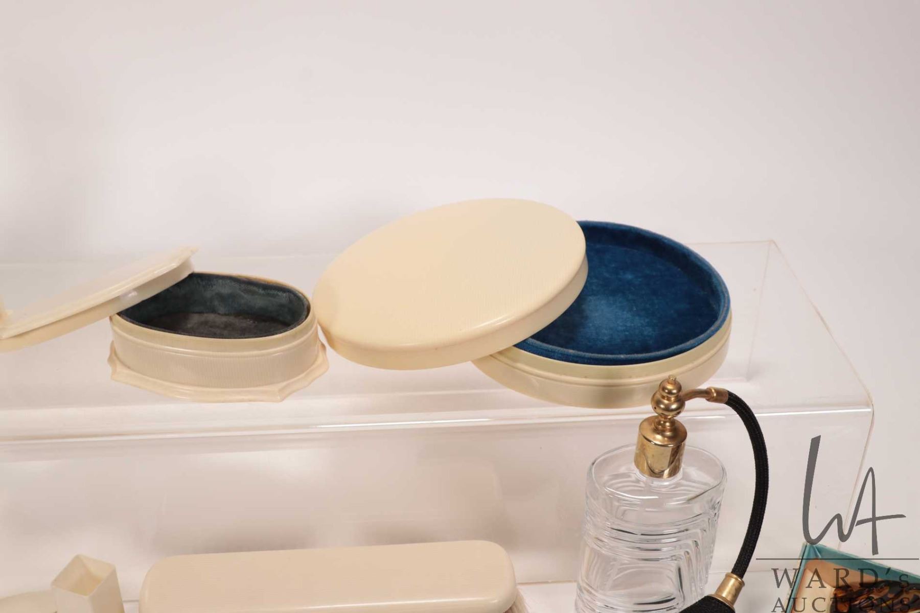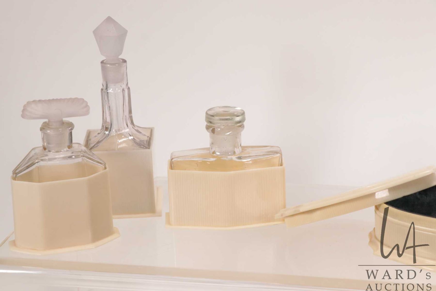Selection of antique French ivory dresser pieces including perfumes bottles, nail buffers, jewel box