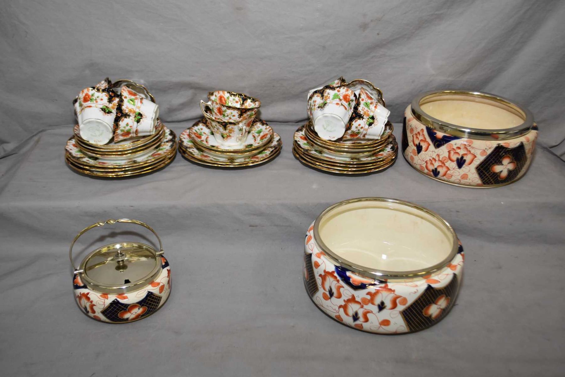 Selection of antique Imari semi porcelain and china including two salad bowls, small spooner with silver-plate rim and lid and ten Duchess China snack plates, cups and saucers NOTE: Not available for shipping. Local bidders only