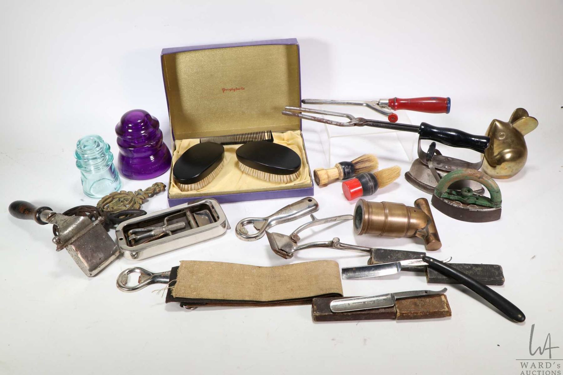 Selection of antique and vintage collectibles including boxed set of gent's hair brushes, two straight razor, shaving brushes, leather strop, curling irons, small sadiron, coloured glass insulators, trivets, hand razor, cannon sans base etc.