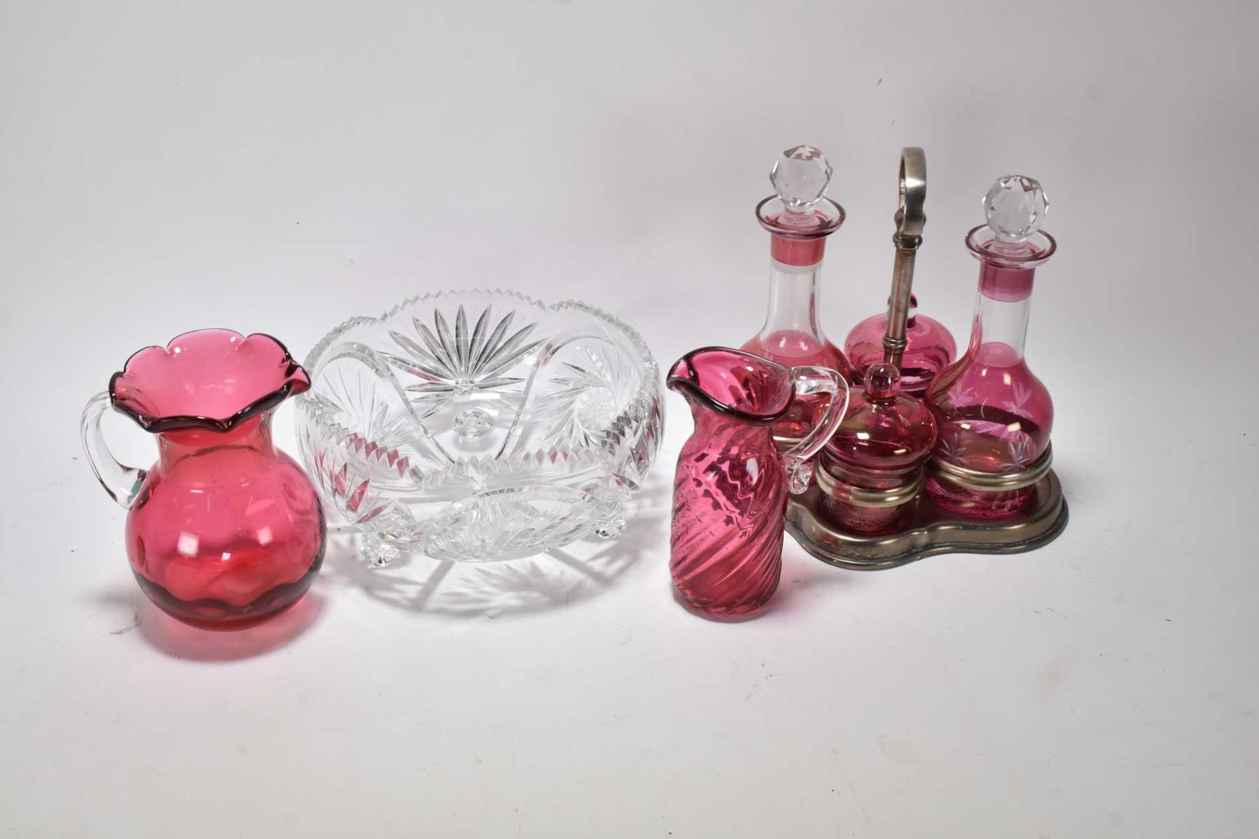 Selection of antique and vintage glass including footed cut crystal bowl, ruby flash cut to clear cruet set in galley plus two 5" high cranberry pitchers with applied colourless handles