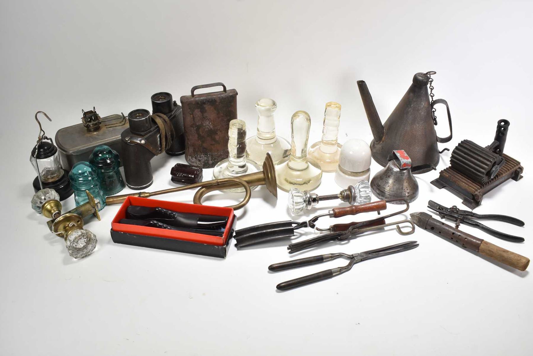 Selection of antique collectibles including four glass rosin stampers, glass door knobs, insulators, binoculars, hanging kettle, lamps etc.