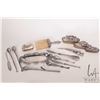 Selection of antique dresser tools including button hooks, curling iron, nail tools, pin tray, small
