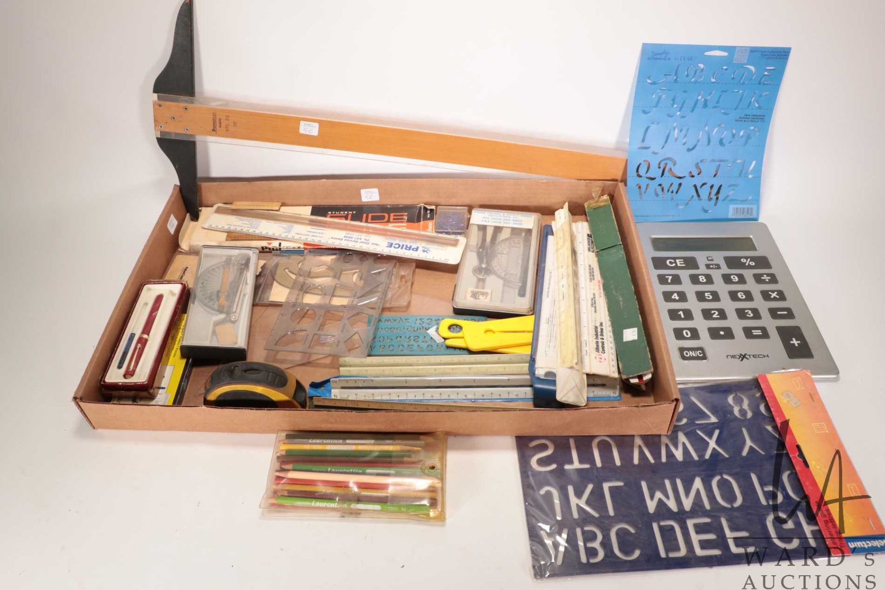Selection of architectural drawing tools including T-square, slide rules, assorted stencils, rulers, compasses etc.