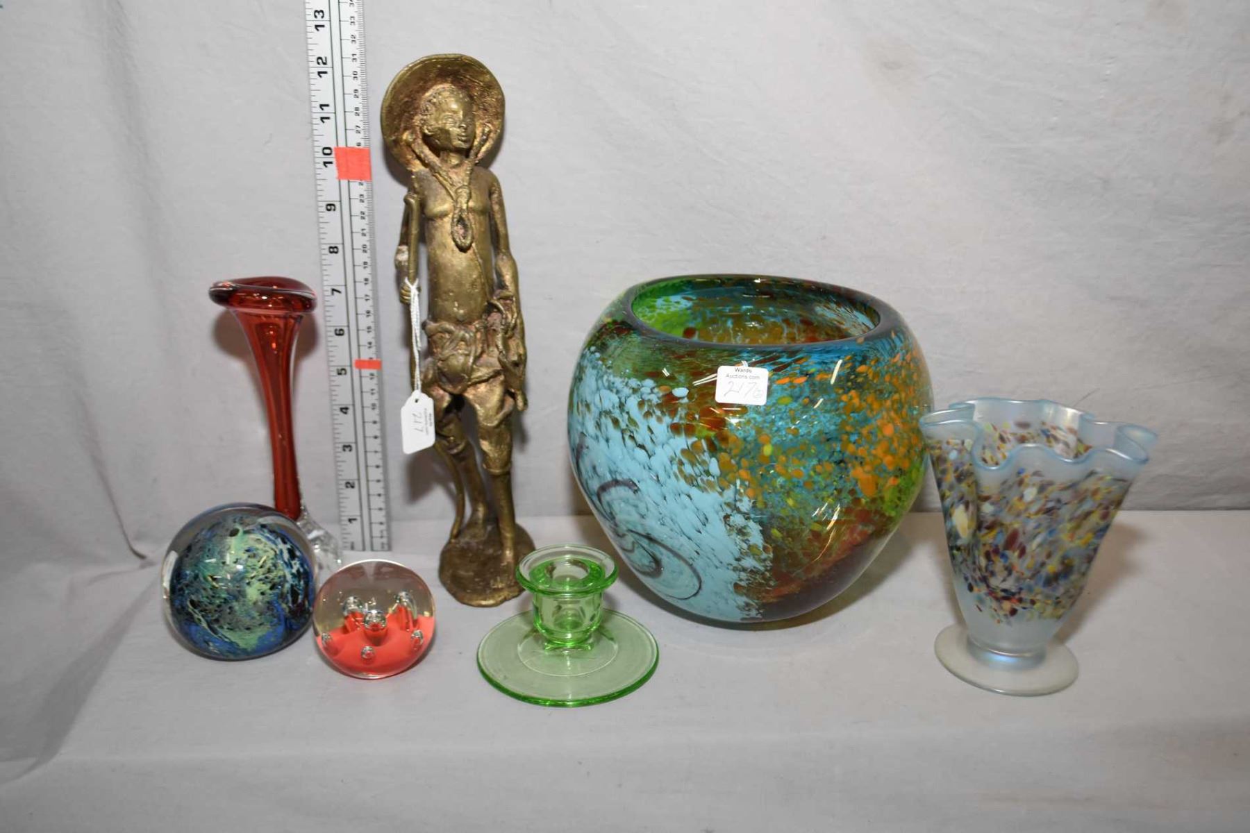 Selection of art glass including 7 1/2" bowl, signed fluted vase, paperweight etc. plus a cast 12 1/2" figure