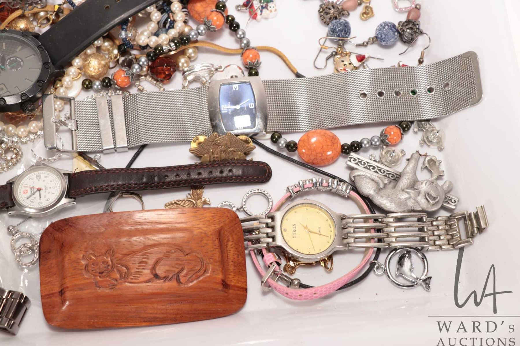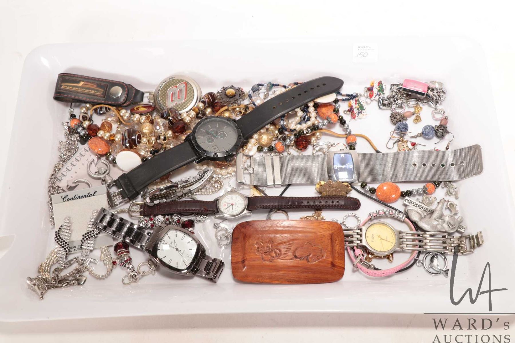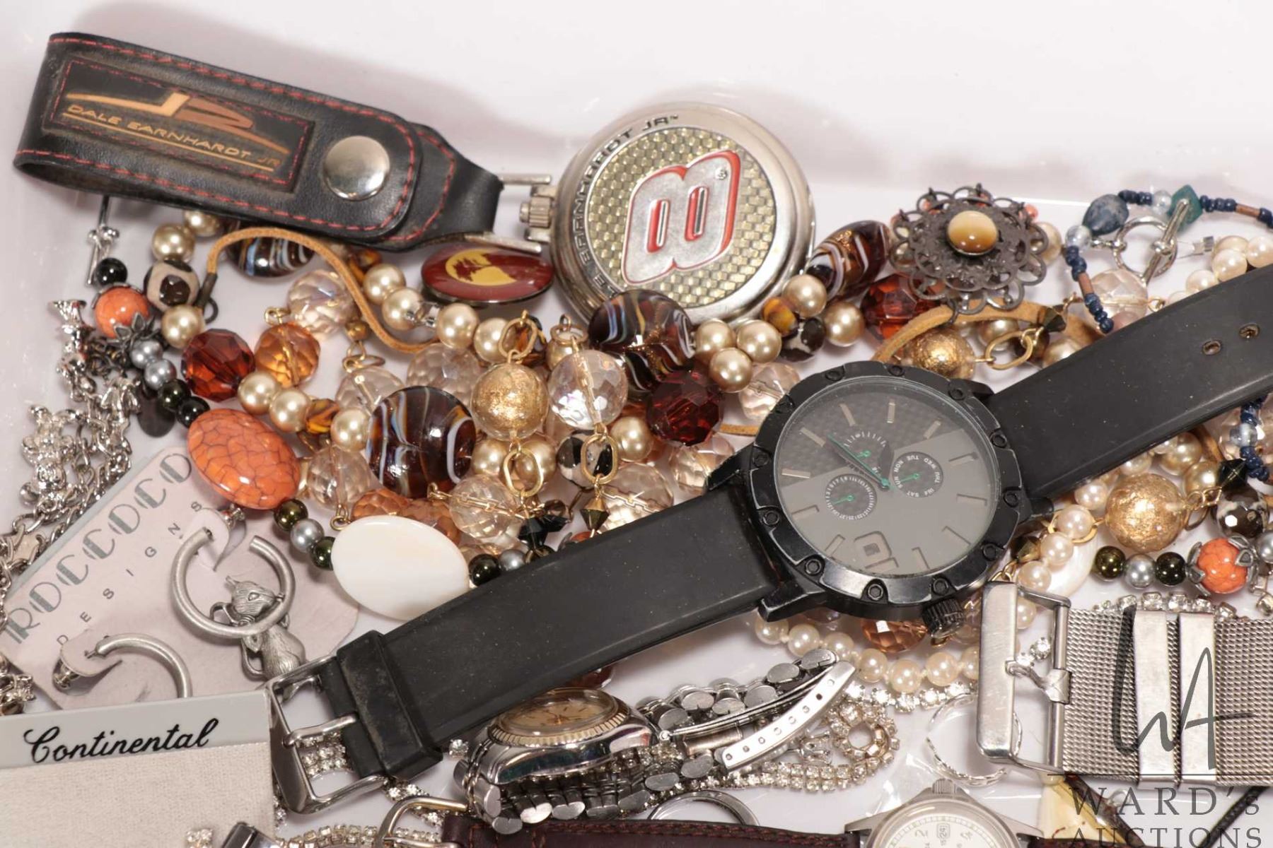 Selection of assorted jewelery including necklaces, bracelets, charm bracelets with charms, earings, pins, plus 8 watches, all quartz and not working at time of cataloguing