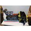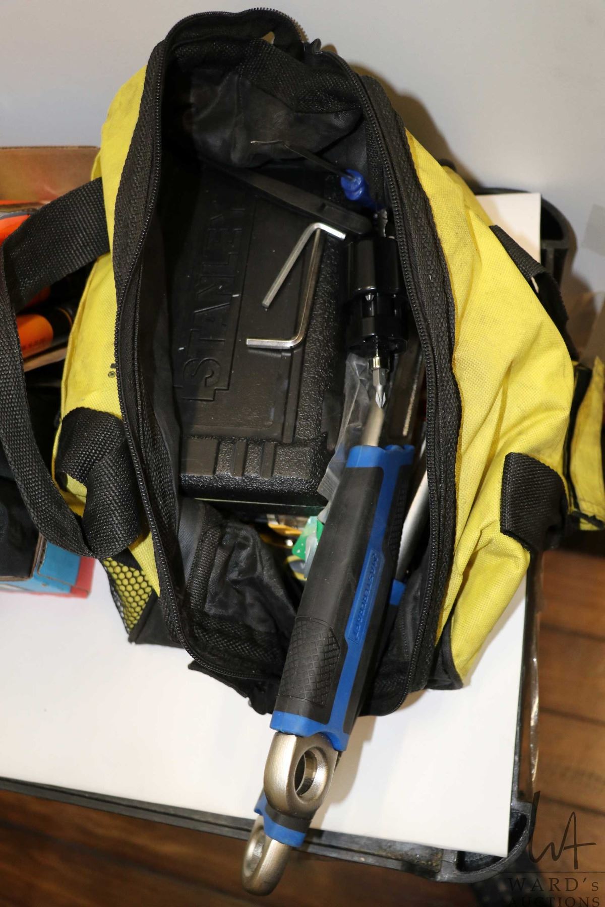 Selection of automotive accessories including booster cables, flashlight/speaker combos, disposable funnels, etc. Plus tool bag w/ assorted tools including bit set, 2 adjustable wrenches and 3/8" Stanley socket set