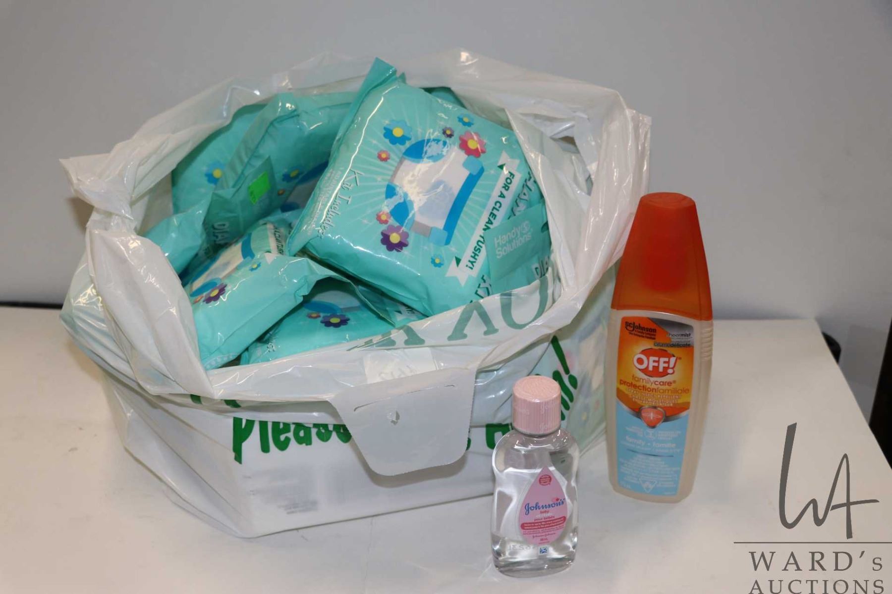 Selection of baby/child items including diaper changing kits, Huggies wipes, baby oil, family insect