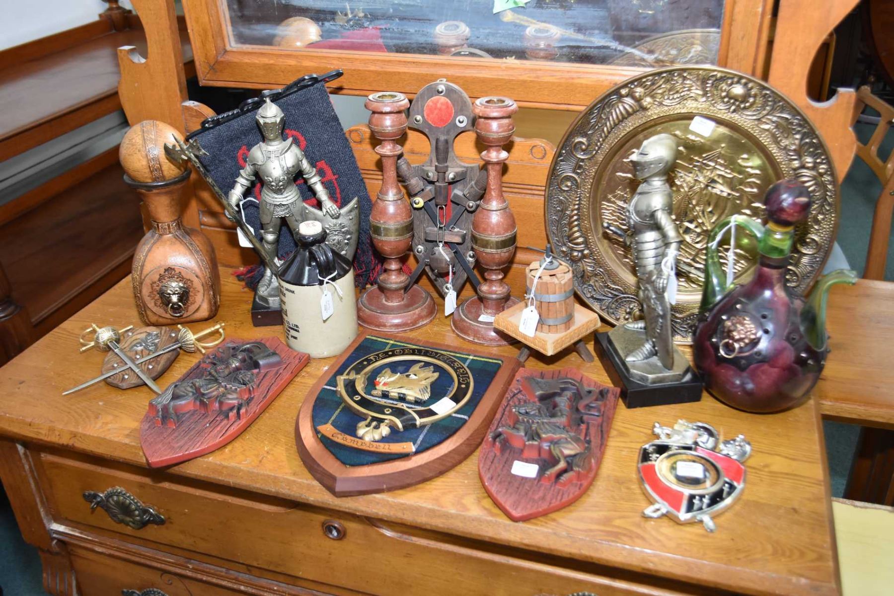 Selection of bar decor items including hanging shields, candleholders, leather bottle, brass plaques, resin decorative knights items