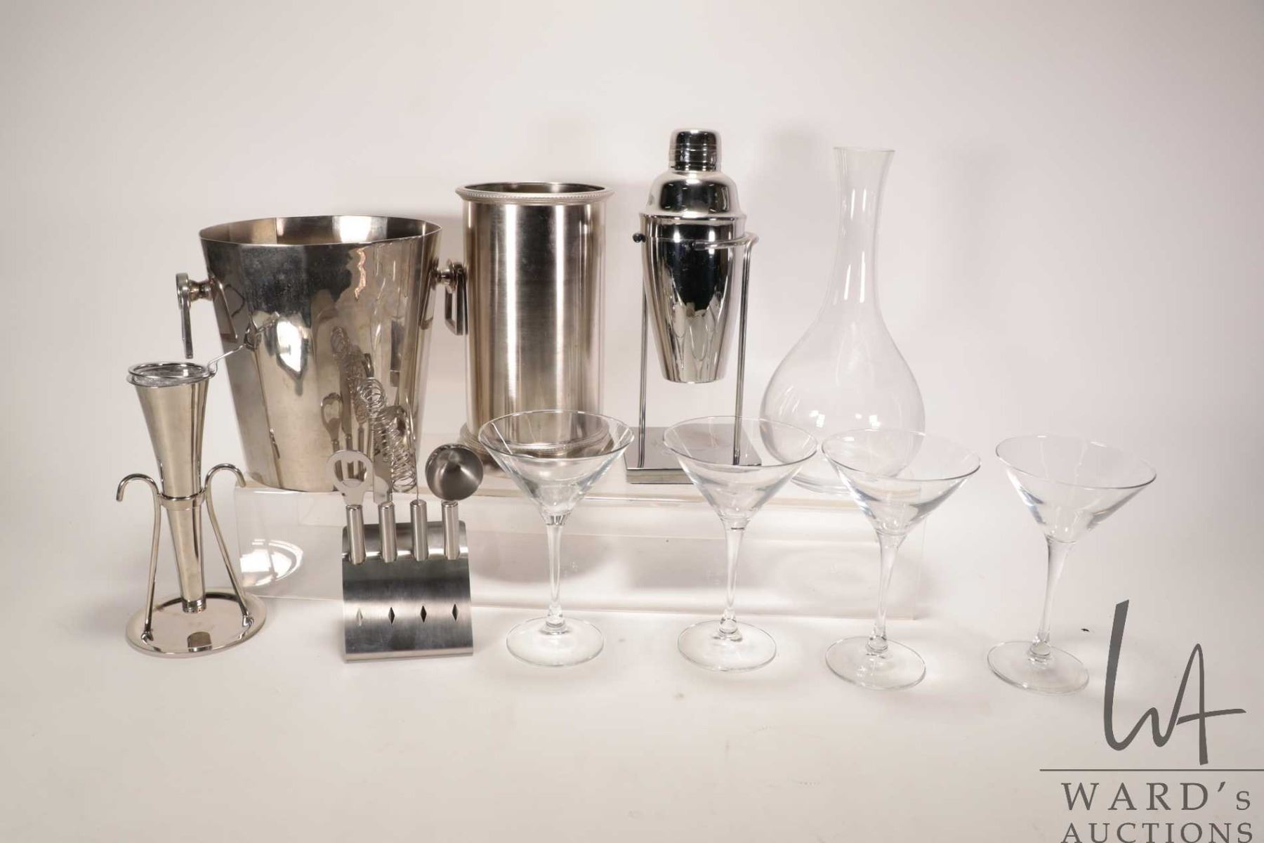 Selection of bar items including martini shaker and four martini glasses, strainer, mixers, glass wi