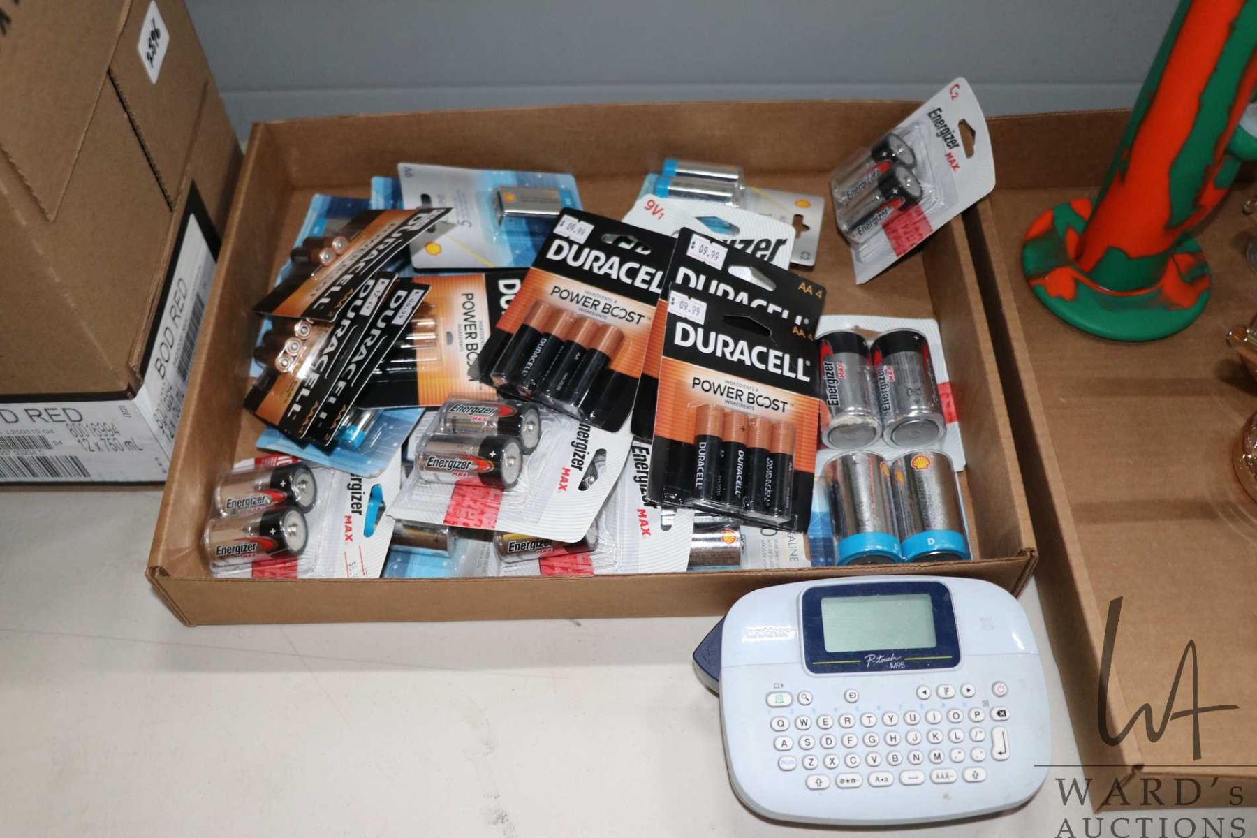 Selection of batteries includign ten Duracell AAA, 8 Shell AAA, 12 Duracell AA, four Shell AA, eight Energizer Max C cells, 8 Shell C cells, two Shell D cells, 3 Engergizer 9 volts and 3 Shell 9 volts plus a Borther P-Touch M95 label maker