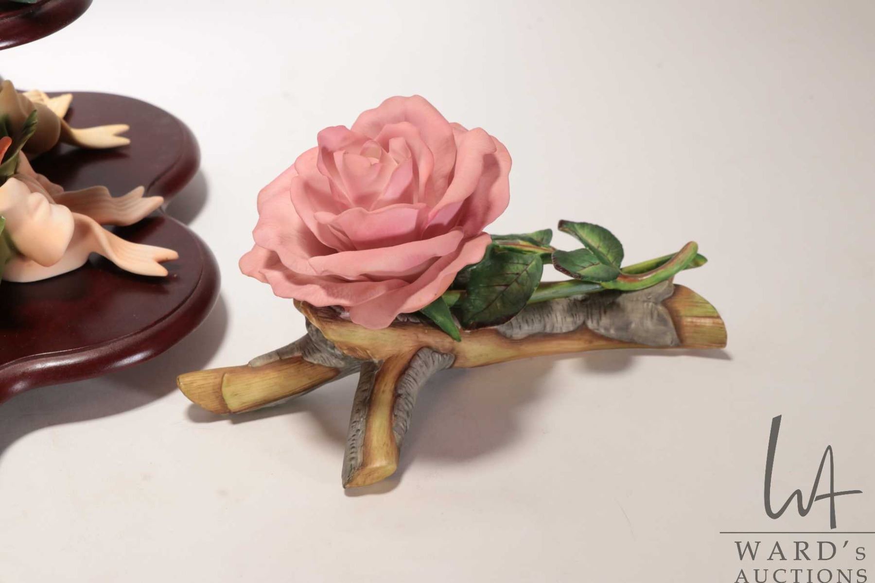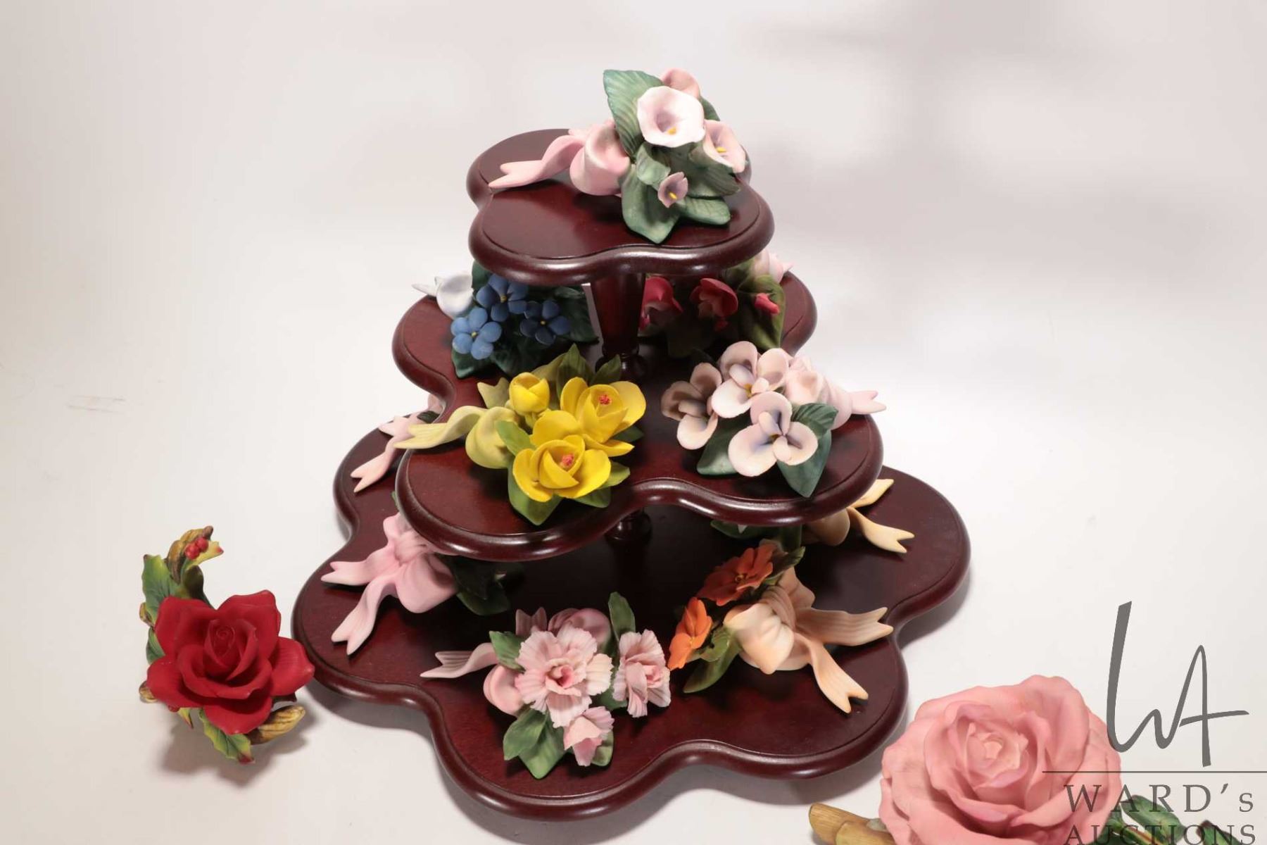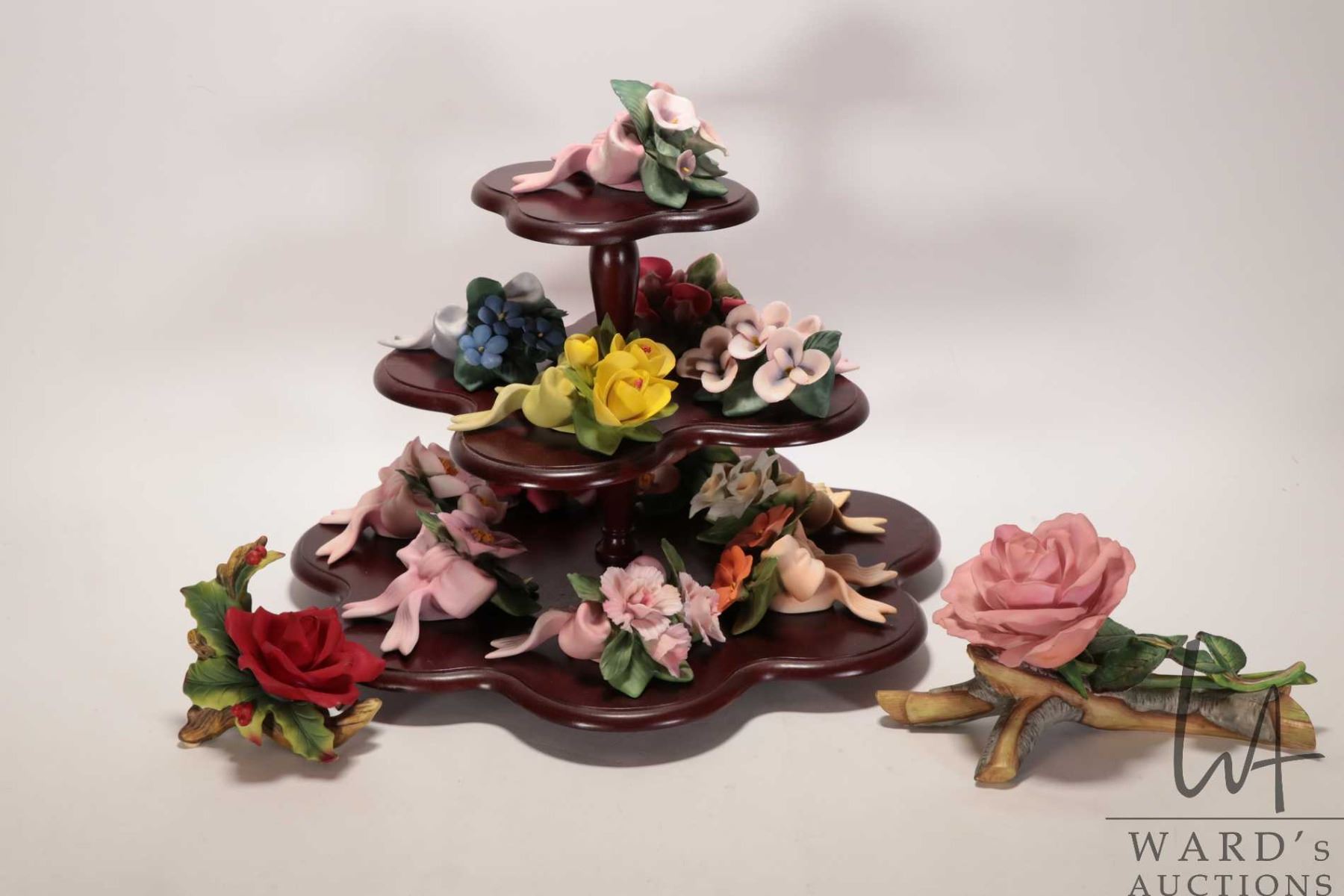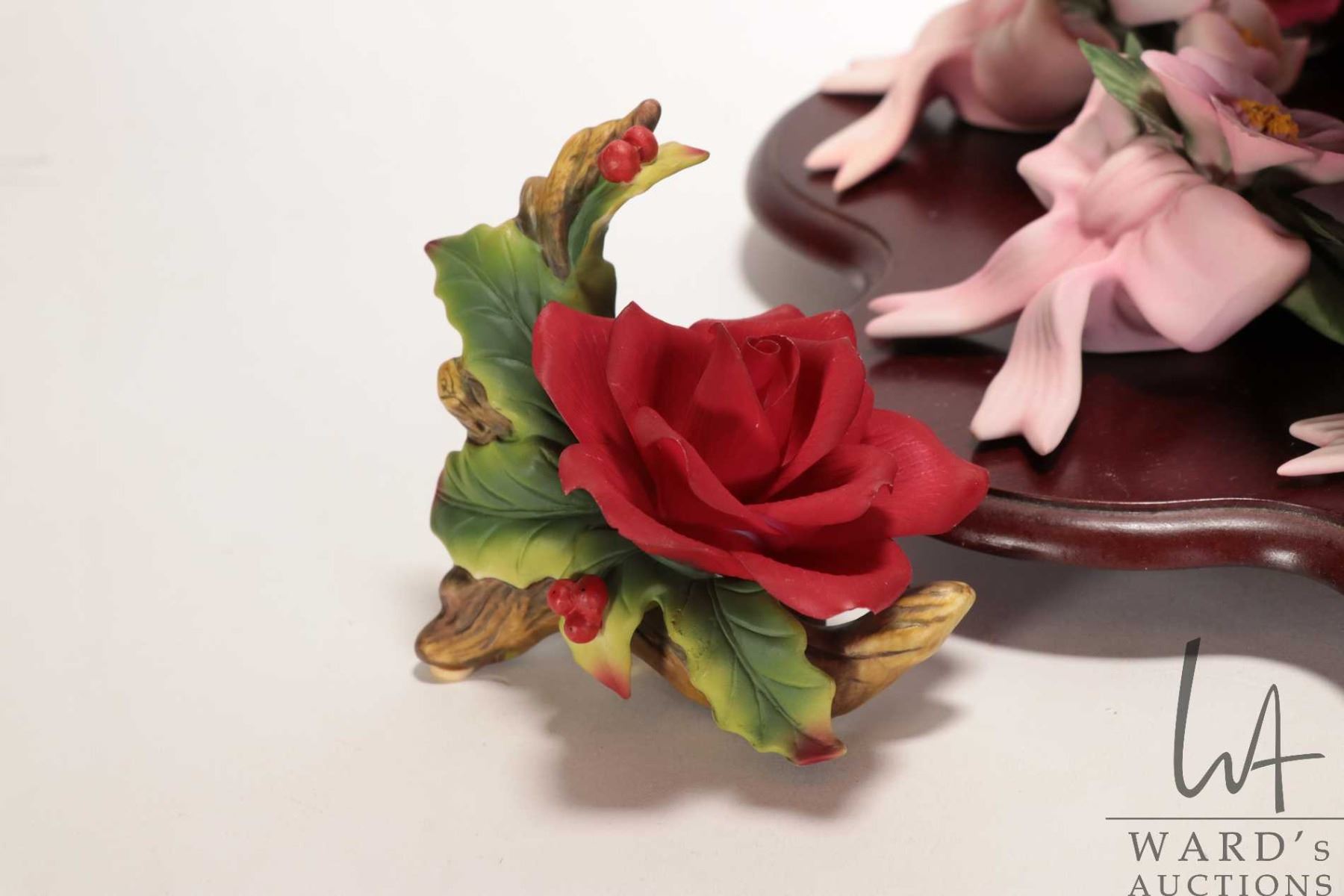 Selection of bisque flowers including set of twelve Tussie-Mussies with wooden display and a Queen Elizabeth Rose and a rose and holly sculptures