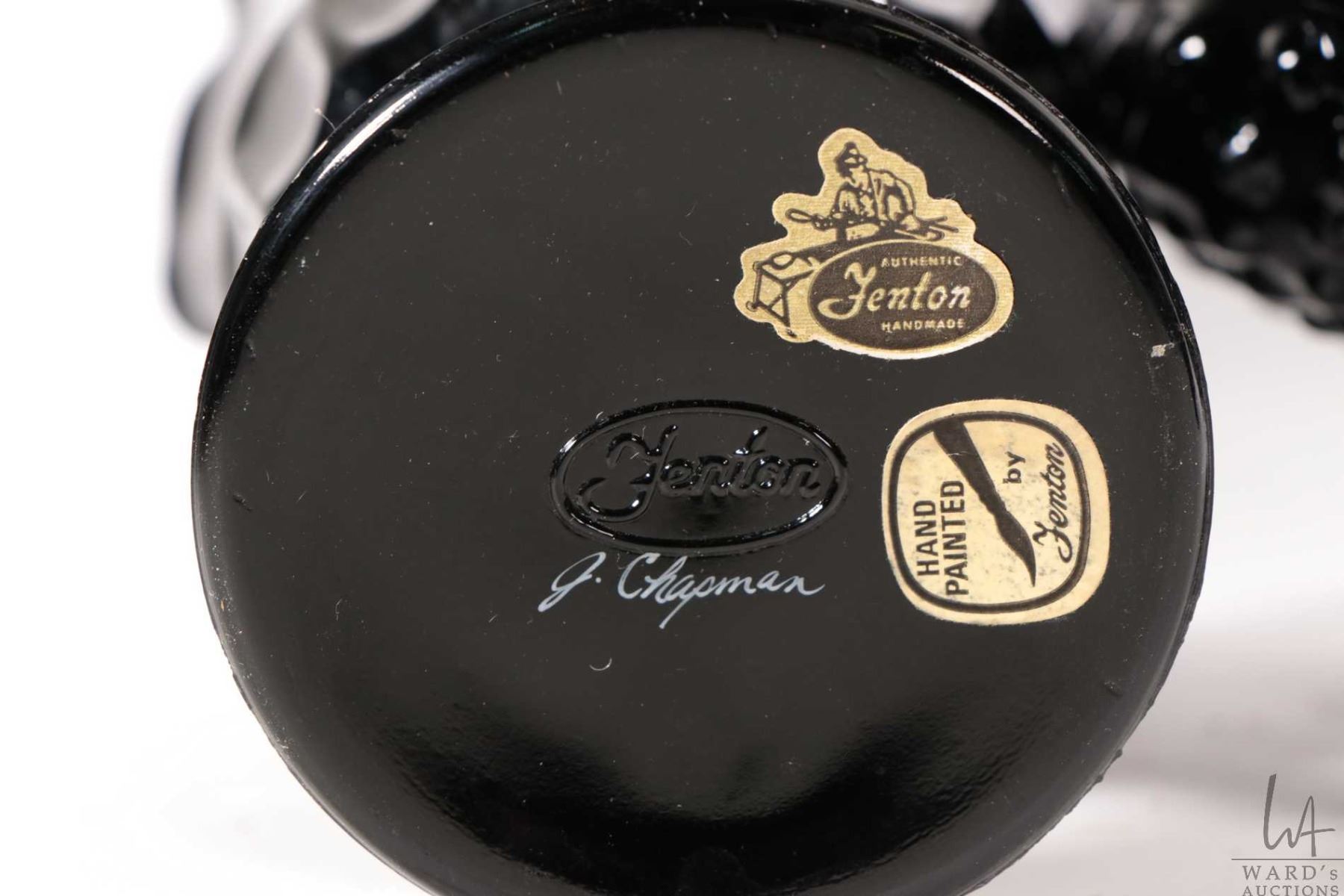 Selection of black Fenton glass including 9" hand painted thumbnail print vase with handkerchief edge signed by artist J. Chapman, pair of candlestick and a six candle flower bowl