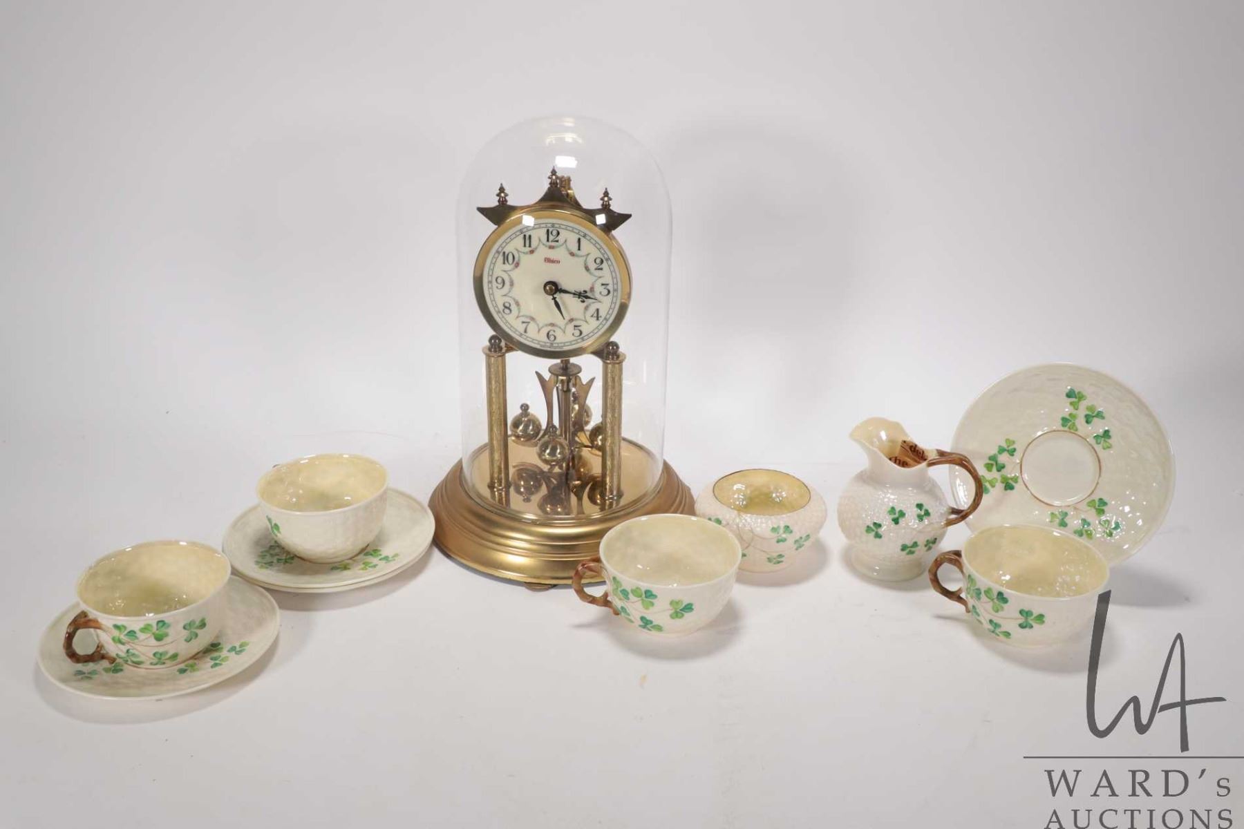 Selection of black mark Belleek shamrock including four cups and saucers plus cream and sugar and a West German made Belico anniversary clock with glass dome and key, working at time of cataloguing. NOTE: This Lot Is Not Available For Shipping. Local pickup only.