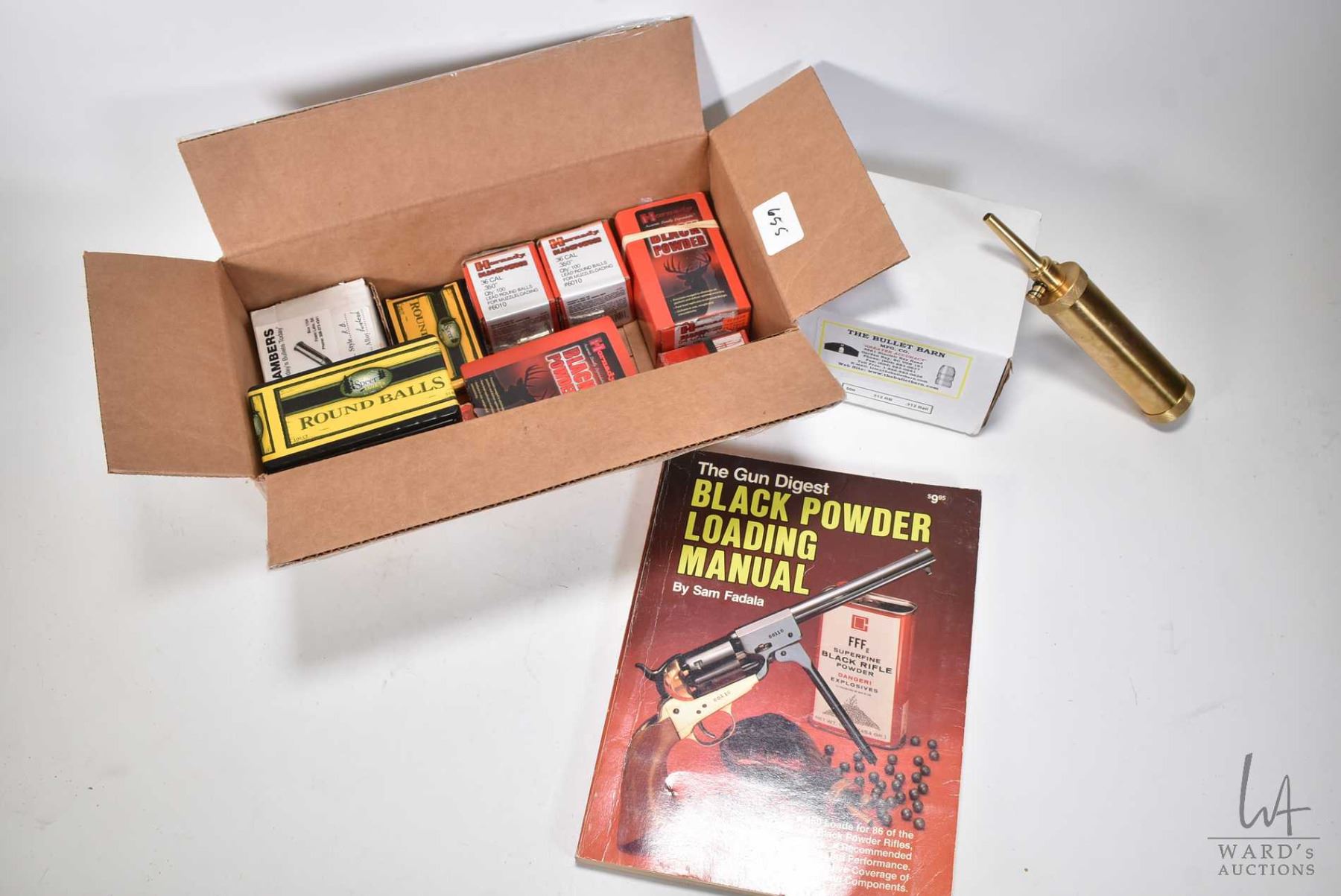Selection of black powder items including various caliber lead round balls, a brass powder measurer, a box of round lead ball and a Black powder manual