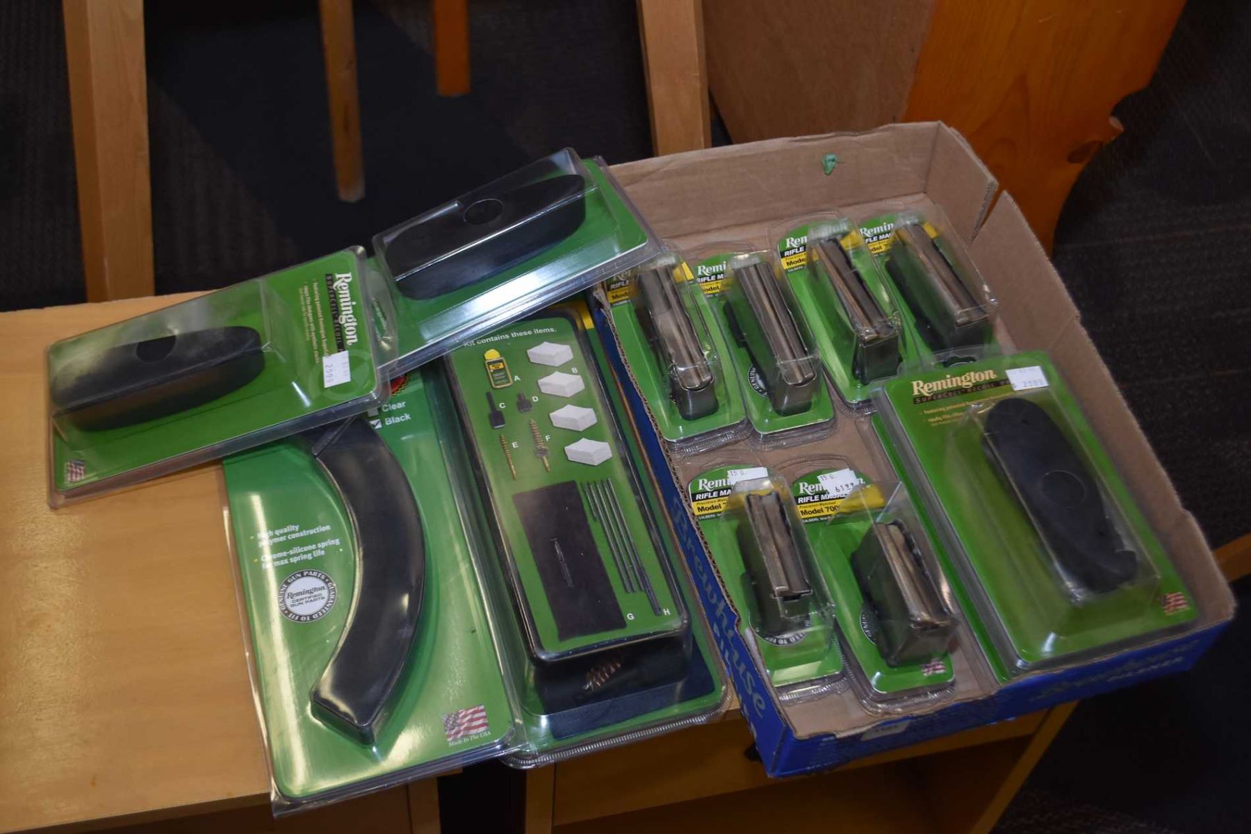 Selection of brand new Remington firearm accessories including cleaning kit for AR rifles, recoil pads, six model 700 magazines and a 30 round model 597 .22 LR mag