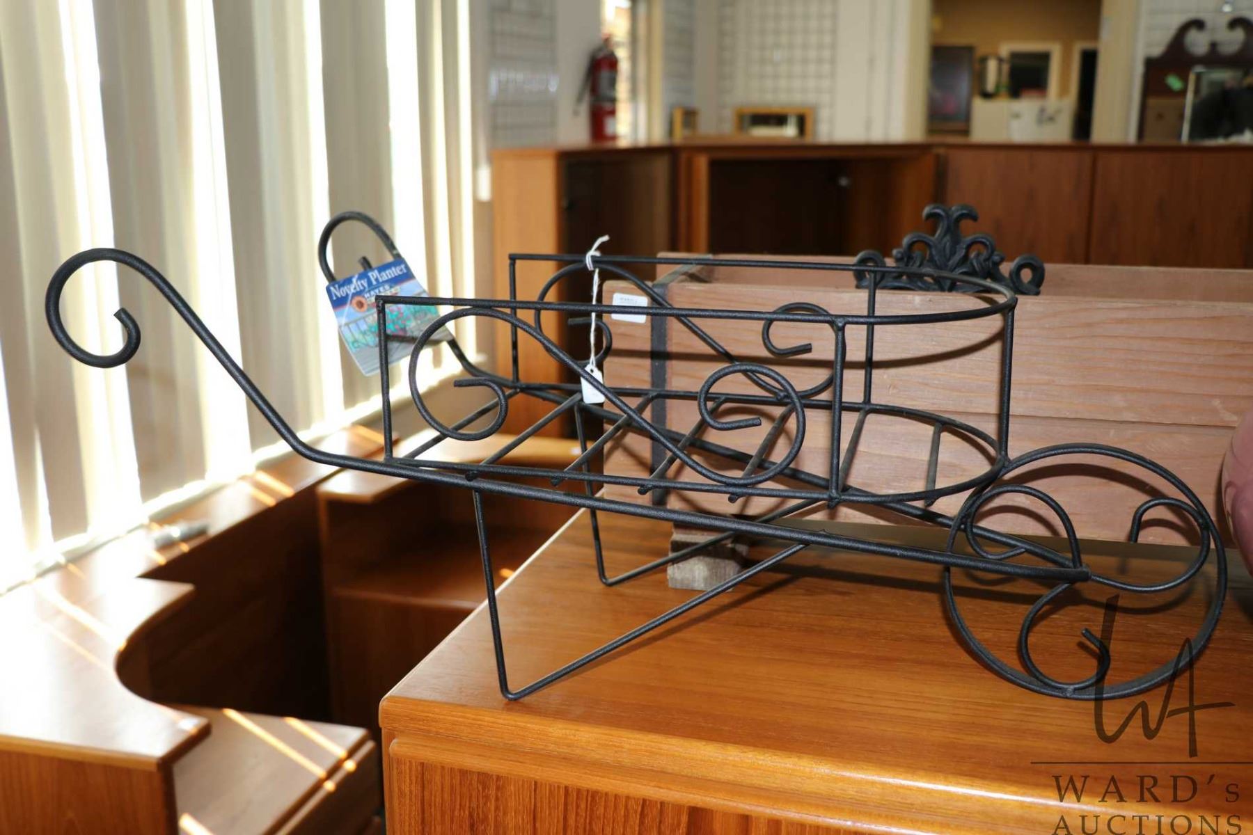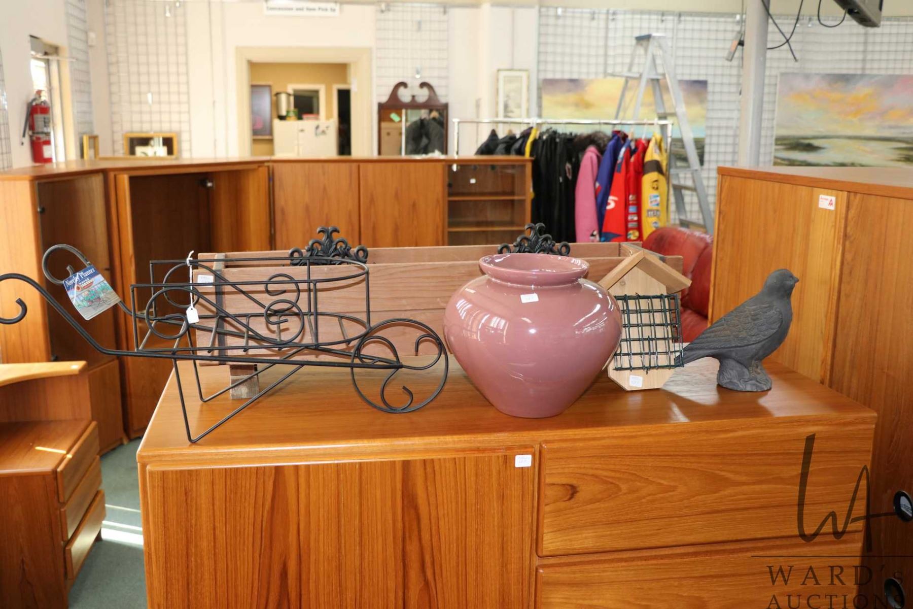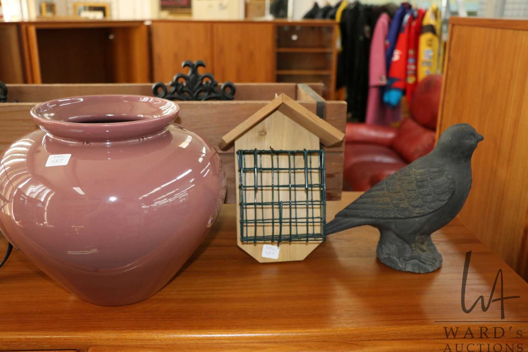 Selection of brand new outdoor and garden accessories including 36" wide wooden planter, hose reels, feeders, planter etc. NOTE: This item is not available for shipping. Local pickup only