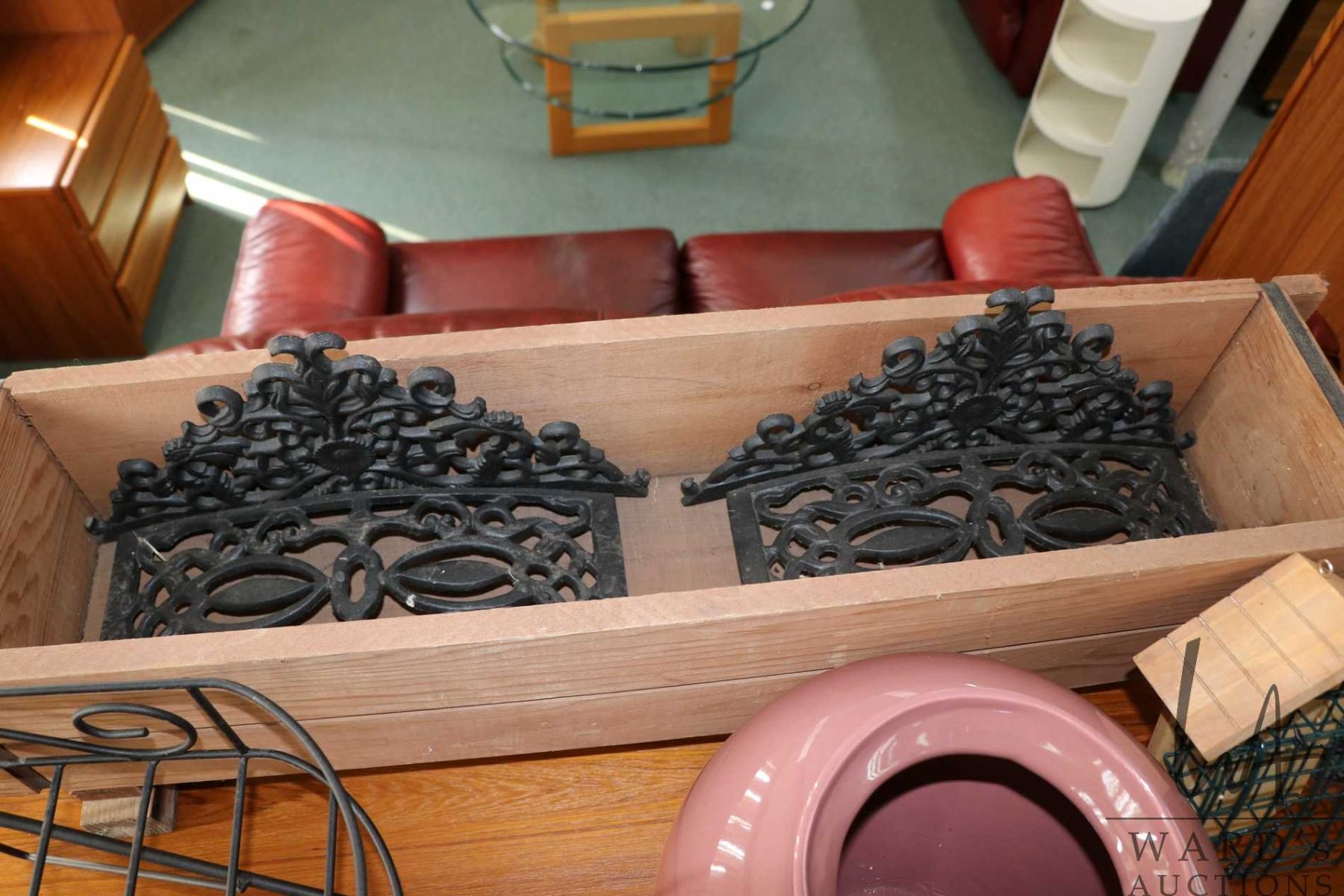 Selection of brand new outdoor and garden accessories including 36" wide wooden planter, hose reels,