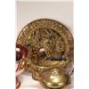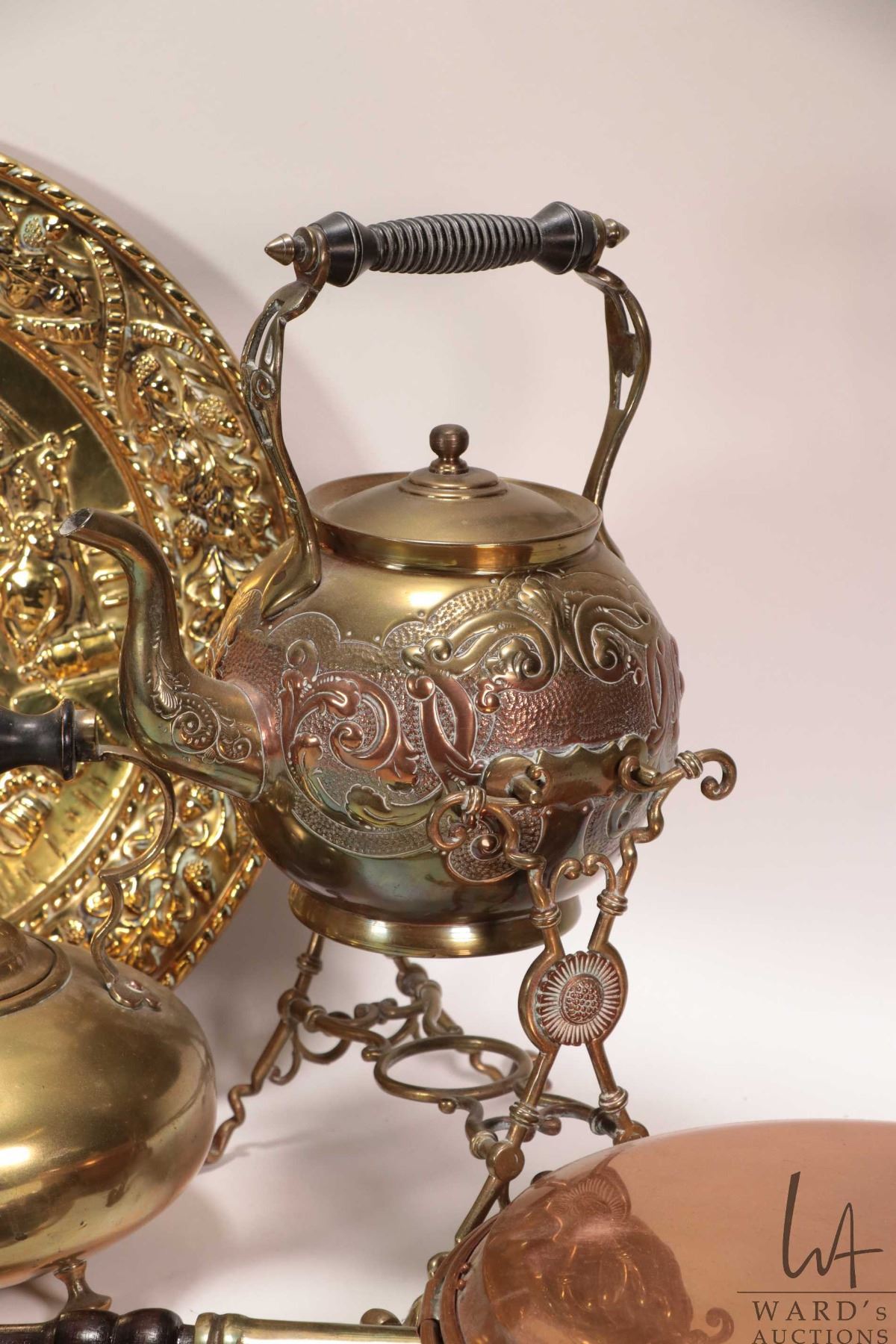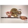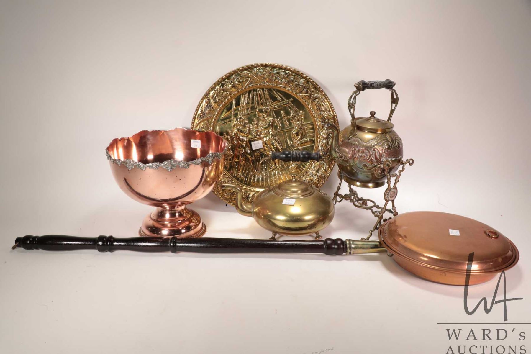 Selection of brass and copper collectibles including 10" diameter copper pedestal bowl with silver plate grape and leaf edge, bas relief charger, bed warmer, kettle and spirit kettle