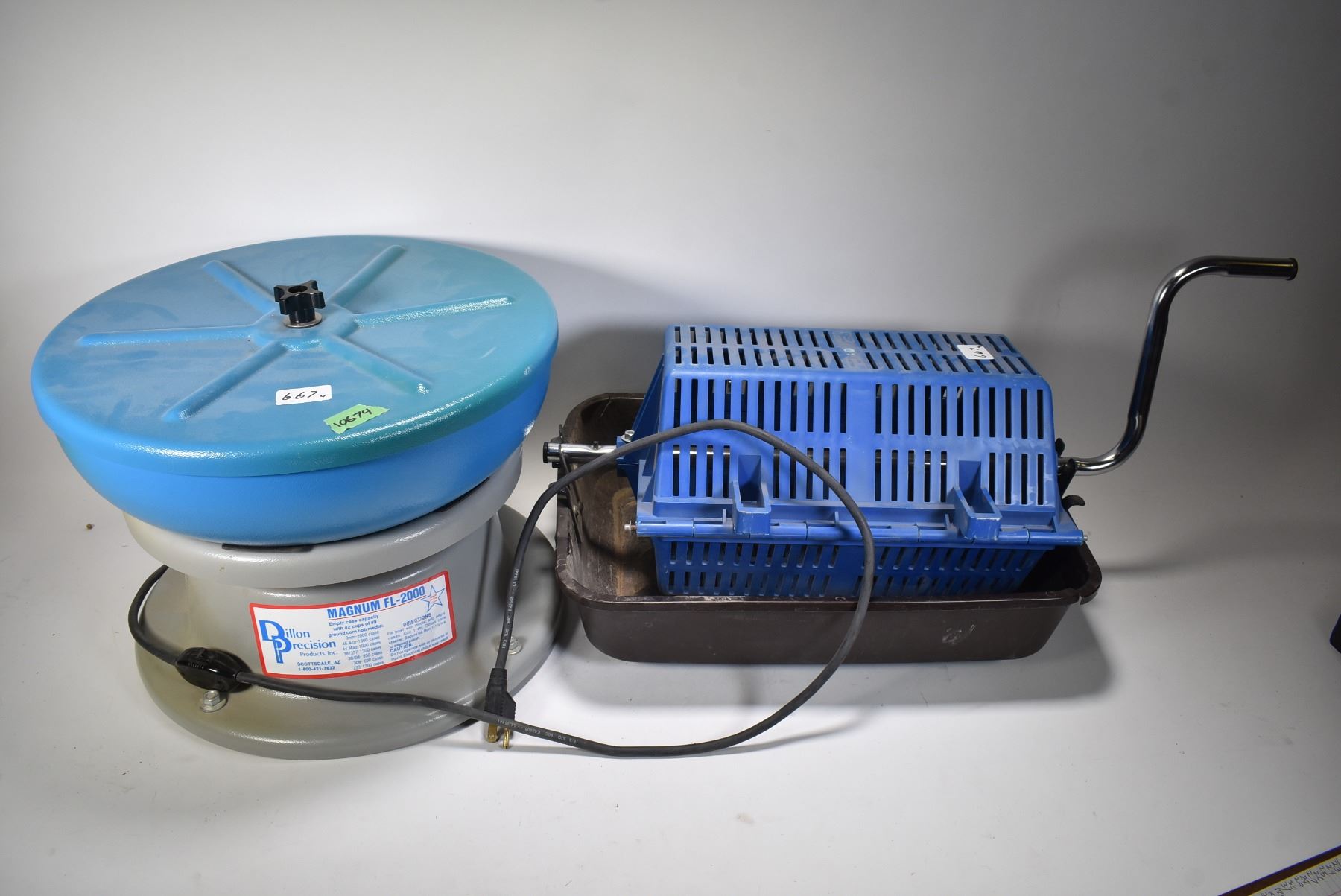 Selection of brass cleaning supplies and equipment including a Dillion Precision Magnum FL 2000 Brass Cleaner/ Vibrator, a Dillon Precision tumbler and a pail of brass cleaning media (walnut shells).