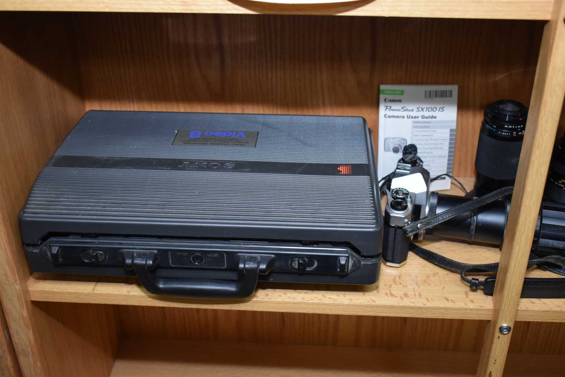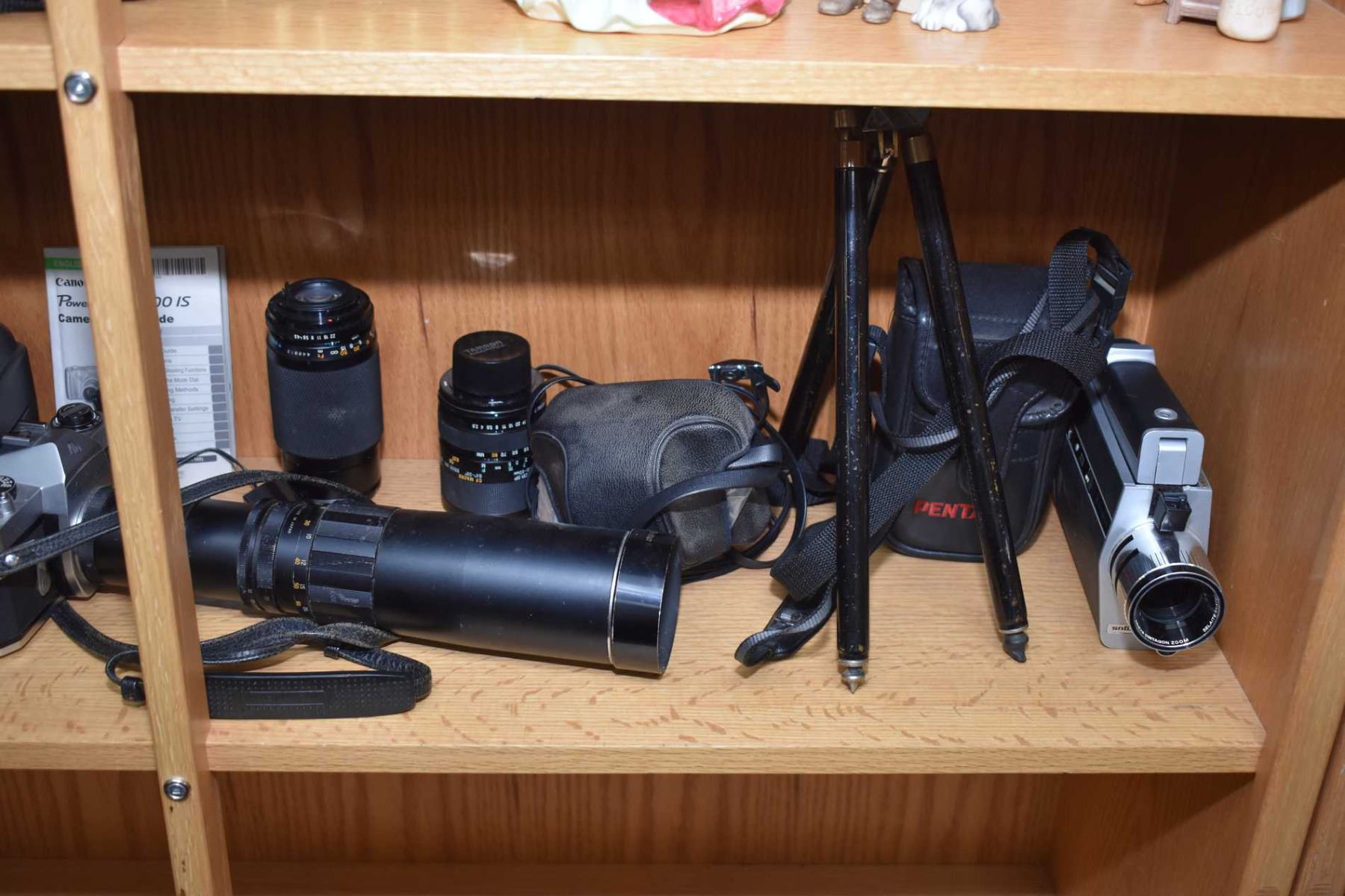 Selection of camera equipment including Sony handicam in hard case, Pentax ASAHI 35mm with telephoto lens. Minolta 35mm Camera, Showmaster Super 8 video camera, assorted lenses etc.