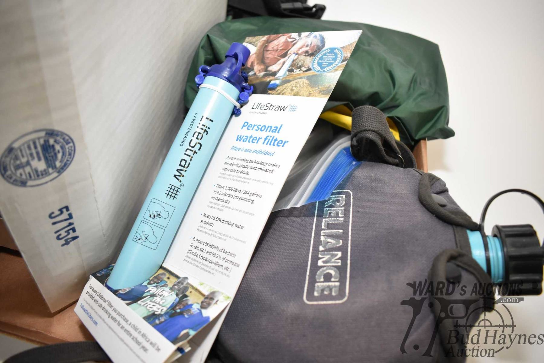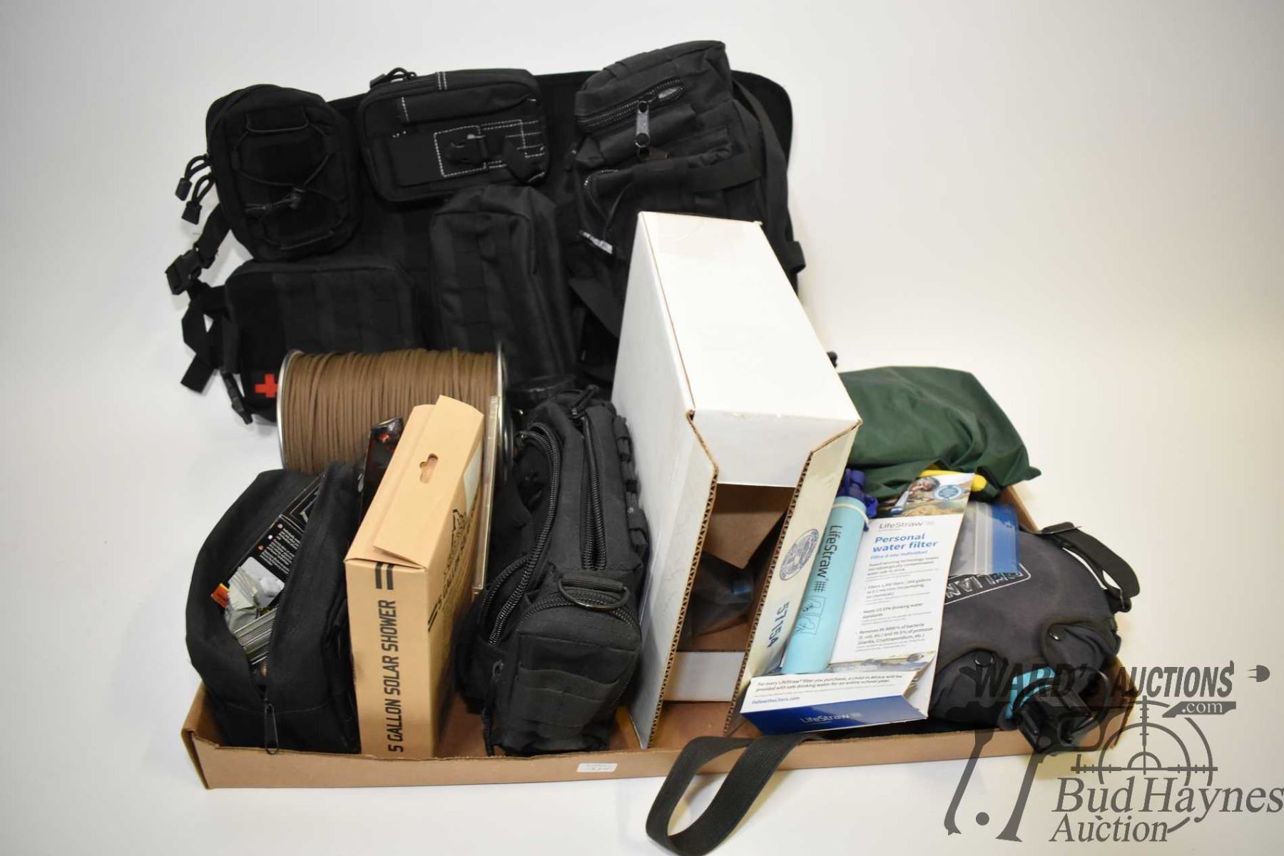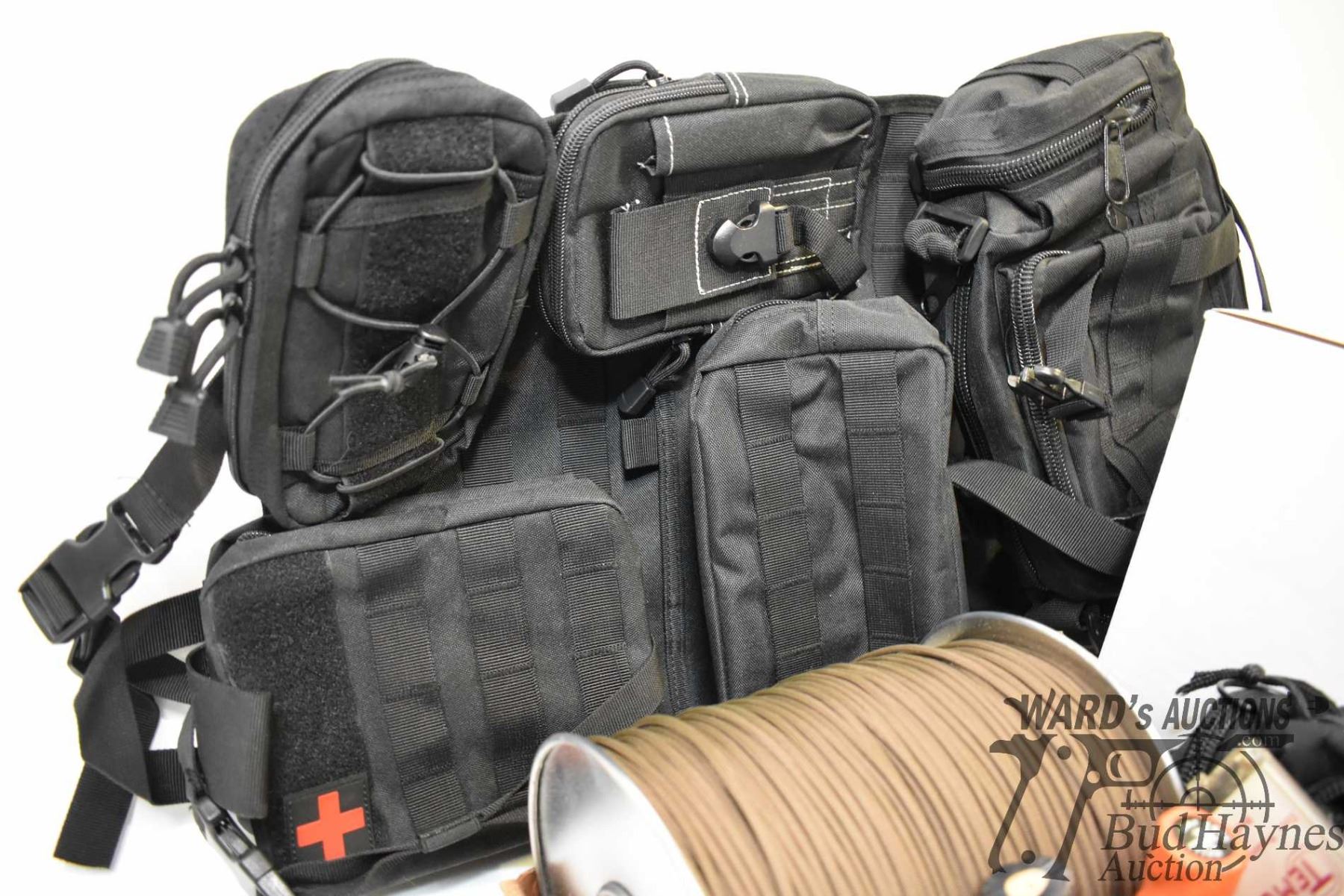 Selection of camping gear including water Selection of camping gear including water filtration kit, shower kit, first-aid kit, rain suit, cord, light, carry pack, fire starters, etc