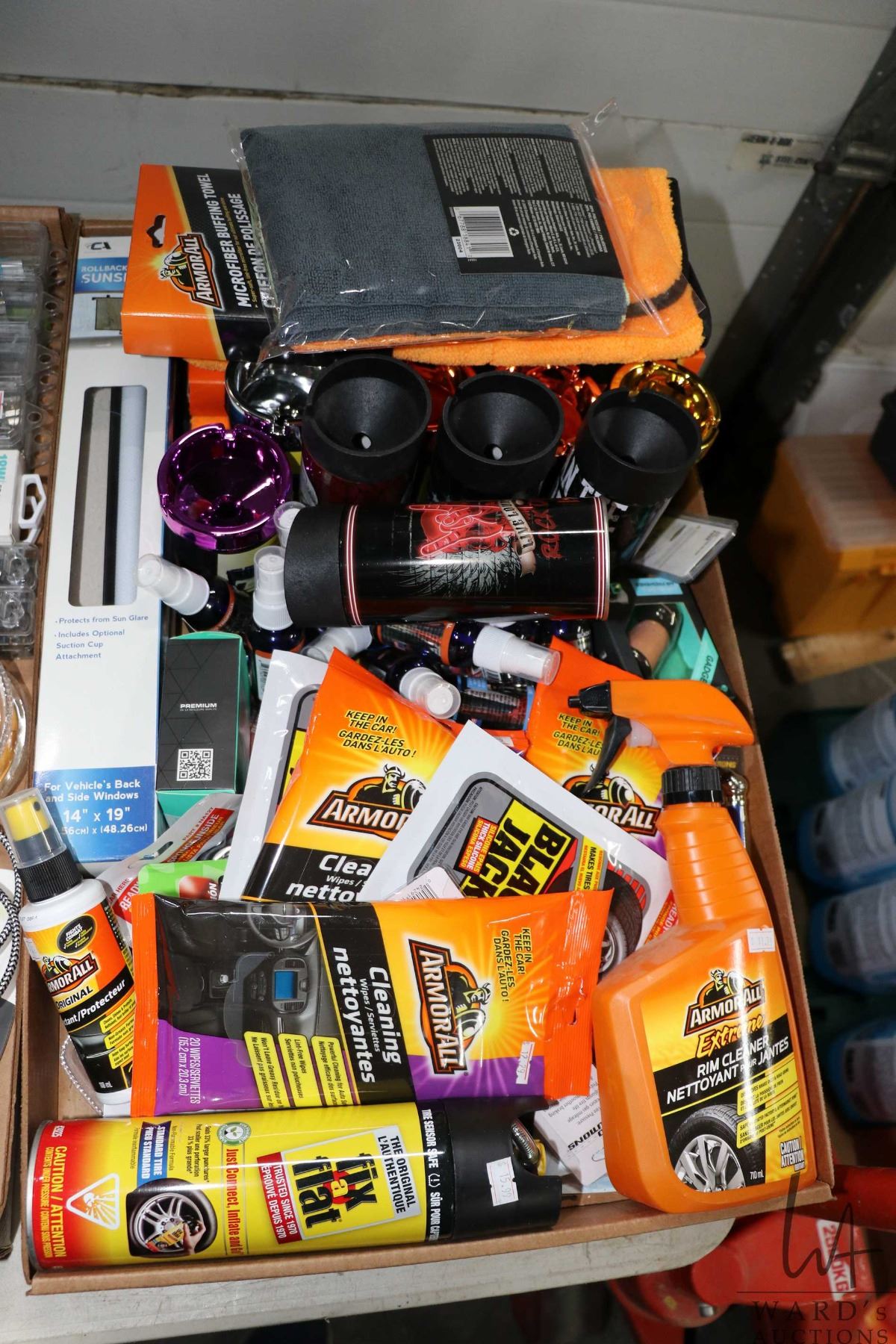 Selection of car care products including Armorall cleaning cloths, polishing towels, rim cleaner, and original clean, sun shades, phone holders, air fresheners and dispensers, ashtray, tire gauges, tire repair kit etc.