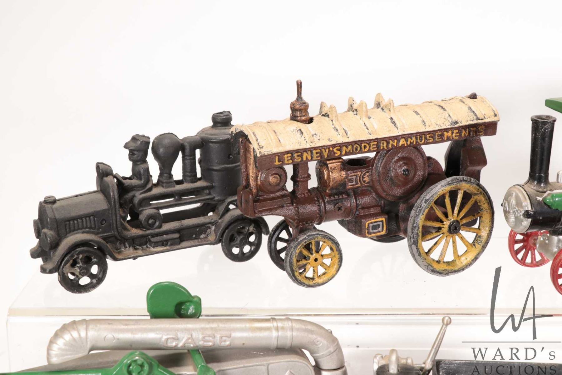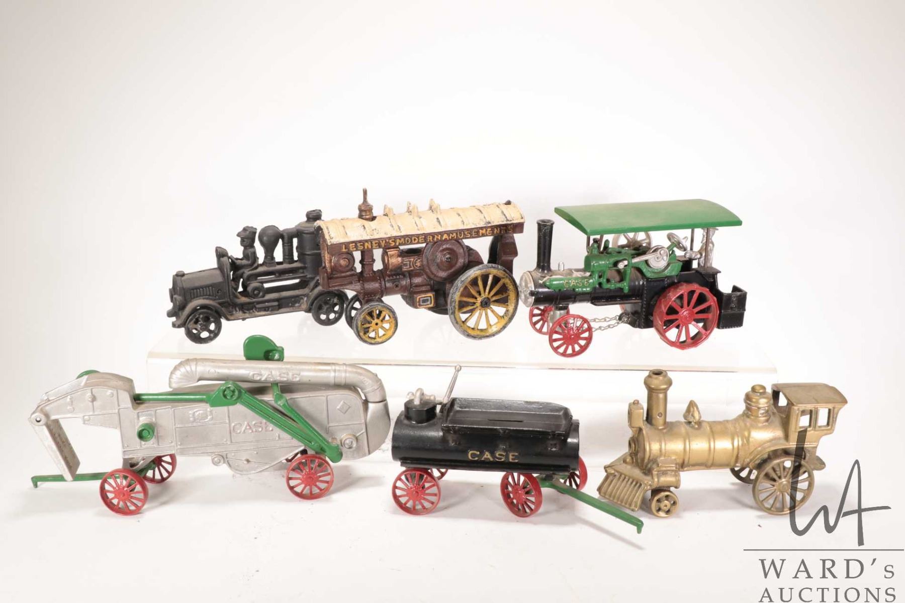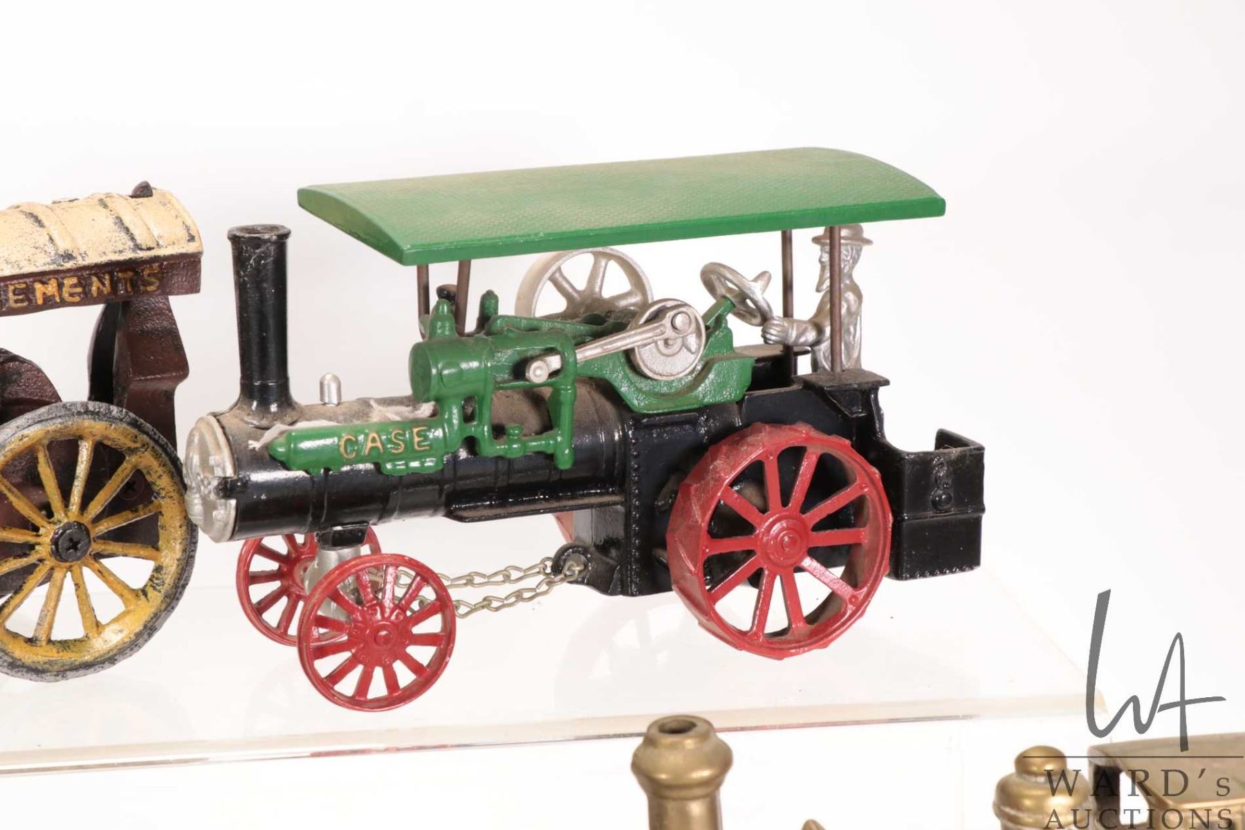 Selection of cast toys including Lesney's Modern Amusements, Case tractor, harvester and water tank plus a fire engine and a steam engine