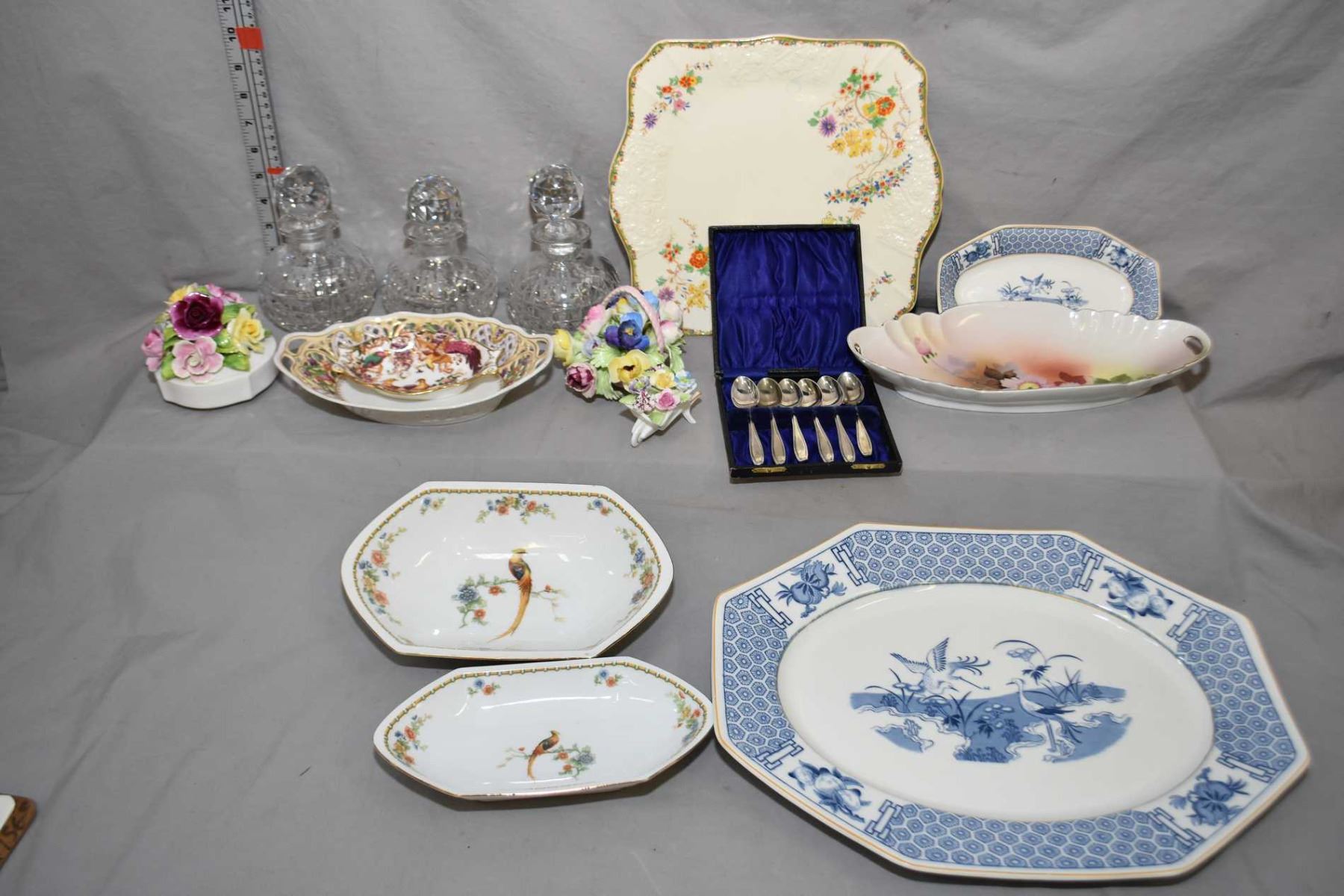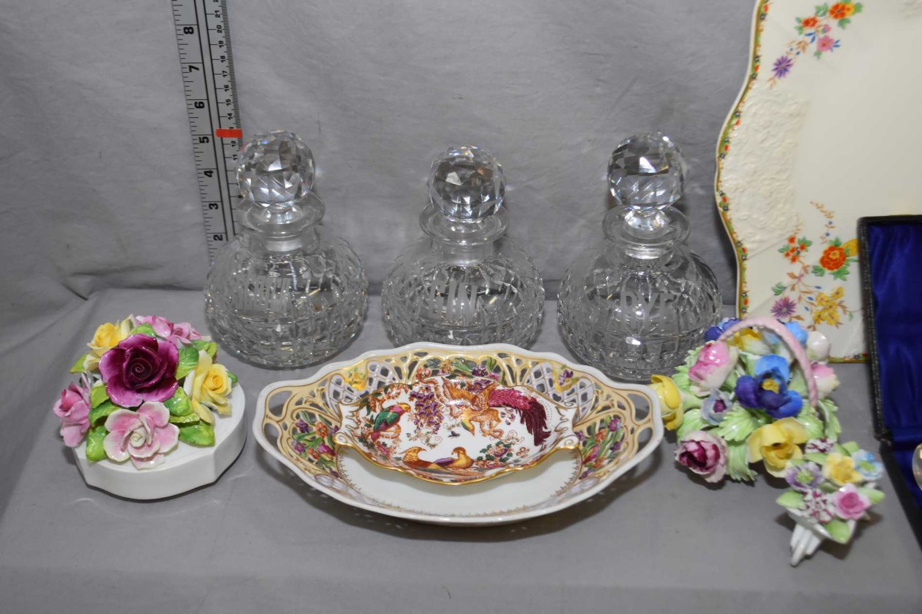 This item is not available for shipping. Local pickup only. Selection of china collectibles including Bavaria and Royal Crown Derby candy dishes, blue and white platter and dish, Noritake dish, three floral plus three small crystal drinks decanter including Rye, Scotch and Gin etc.