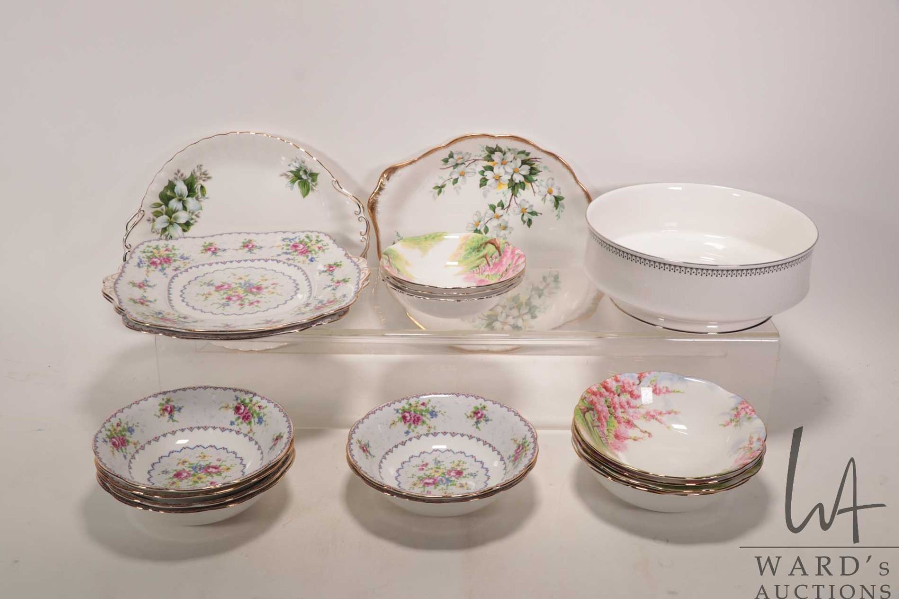 Selection of china collectibles including Paragon Olympus 8 1/4" diameter bowl and Royal Albert including Petit Point double handled plate plus six cereal bowls, Lavender Rose double handled plate, Trillium plate and White Dogwood, four Blossom Time cereal bowls and three fruit nappies incuding Blossom Time and two Tranquility. Note: Not available for shipping. Local pickup only