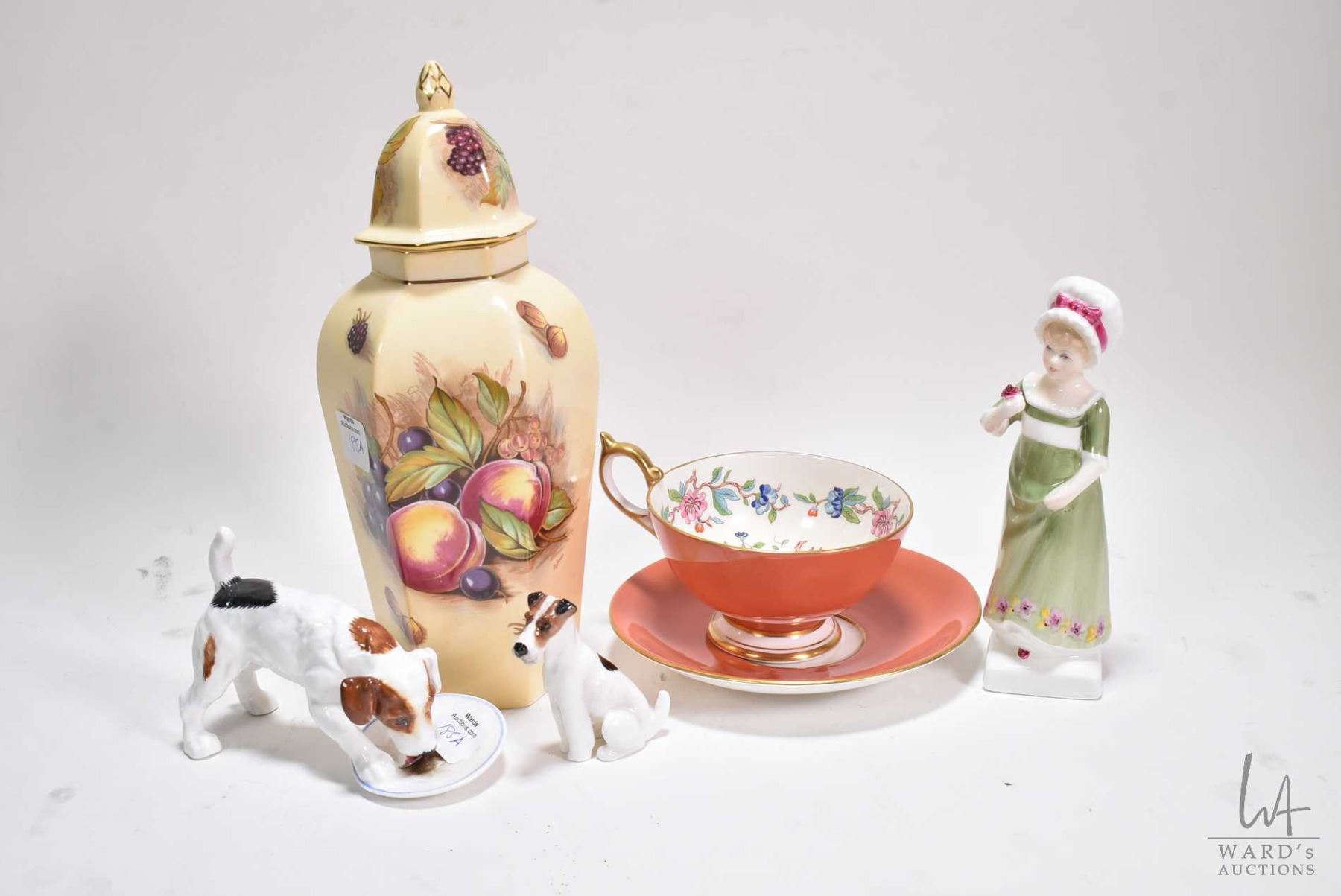 Selection of china collectibles including lidded Aynsley jar 10", china cup and saucer, Royal Doulton dog HN1158 and smaller dog, plus Royal Doulton figure from the Kate Greenaway Collection "Ruth" HN2799
