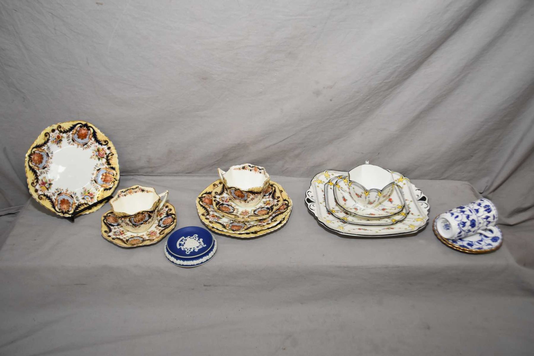 Selection of china collectibles including two fine tea cups, saucers and side plates, two Spode demitasses, a Shelley tea cup, saucer, side plate and sandwich tray plus a Adams Tunstall dish NOTE: Not available for shipping. Local bidders only