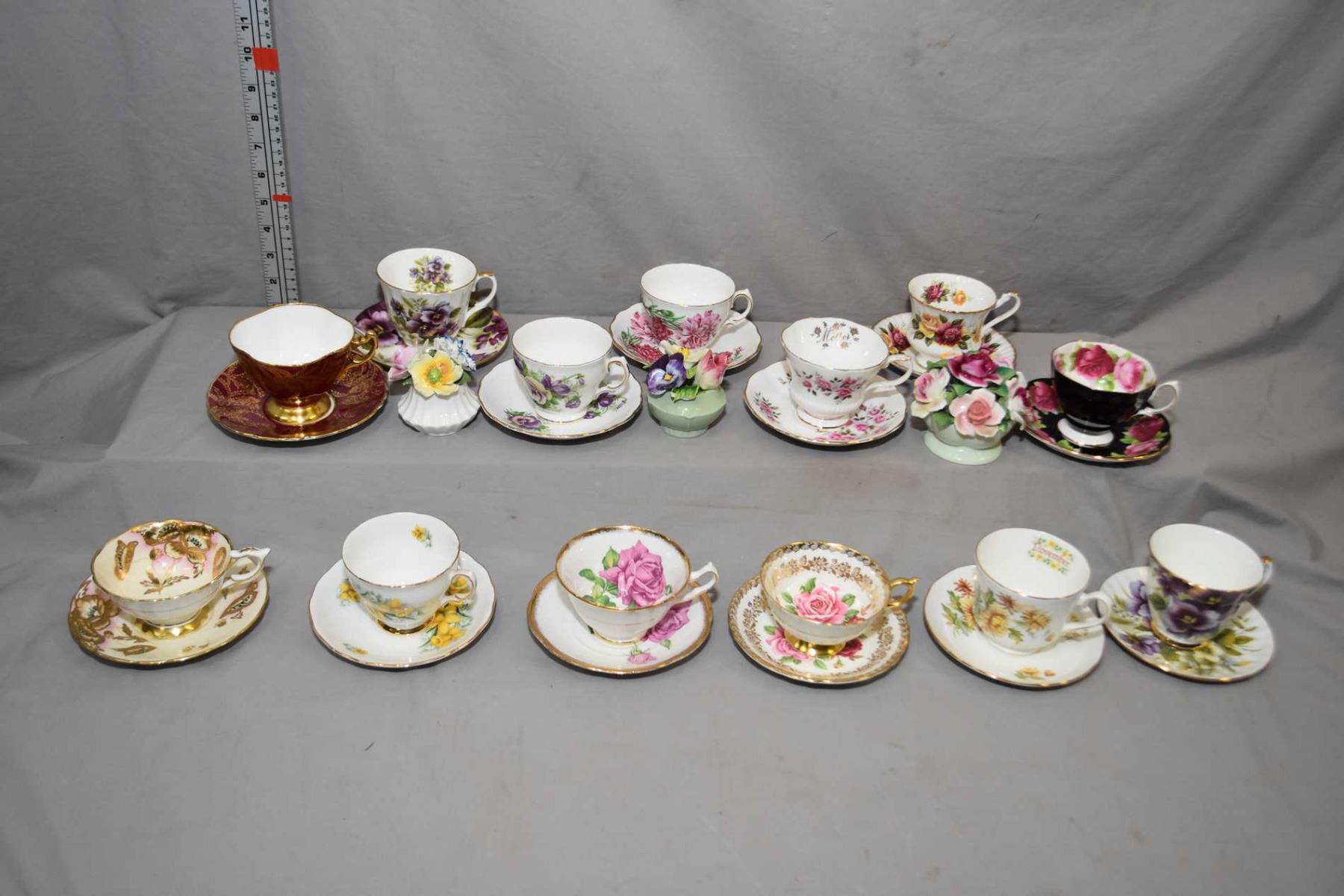 Selection of china cups and saucers including Royal Albert, Paragon, Royal Vale, Duchess, Royal Staf