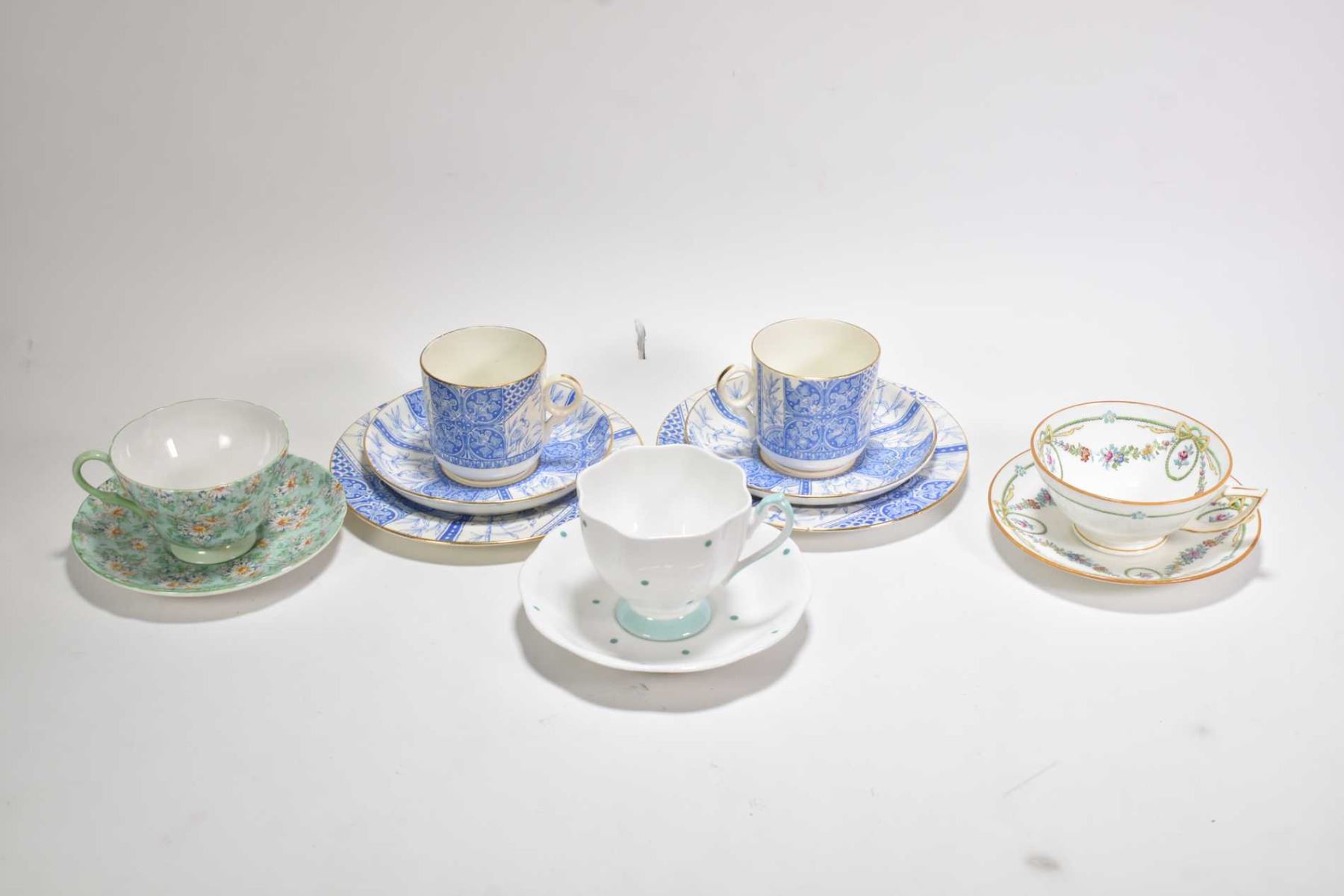 Selection of china including two antique blue and white china cups and saucers with side plates plus Shelley chintz , Minton and Bell china cups and saucer